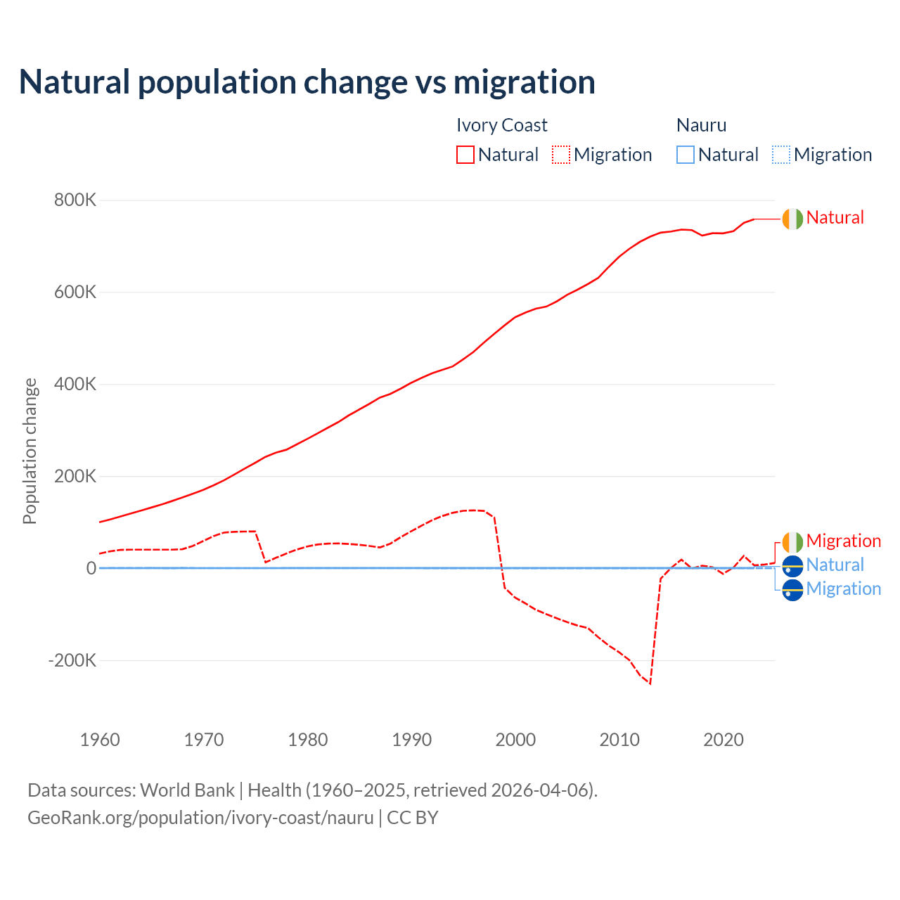 Over the last 10 years, 99.7% of the population change in Ivory Coast is from natural causes (a gain of 7,348,944 people) and 0.33% is from migration (a gain of 24,432 people). In Nauru 66.2% is from natural causes (a gain of 2,590 people) and 33.8% is from migration (a loss of 1,320 people).
