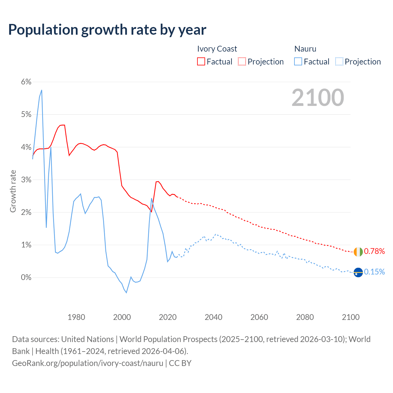 - For the last 10 years, Ivory Coast has had an average growth rate of +2.65% per year vs +1.17% in Nauru.