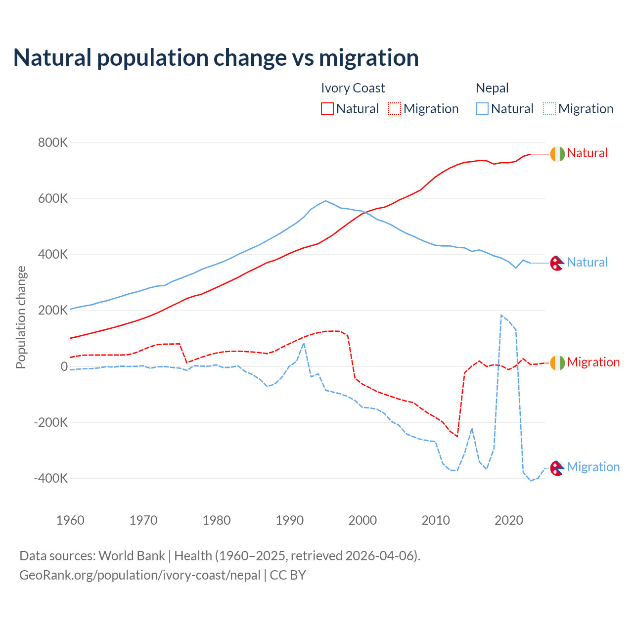 Over the last 10 years, 99.7% of the population change in Ivory Coast is from natural causes (a gain of 7,348,944 people) and 0.33% is from migration (a gain of 24,432 people). In Nepal 67.9% is from natural causes (a gain of 3,909,749 people) and 32.1% is from migration (a loss of 1,851,664 people).