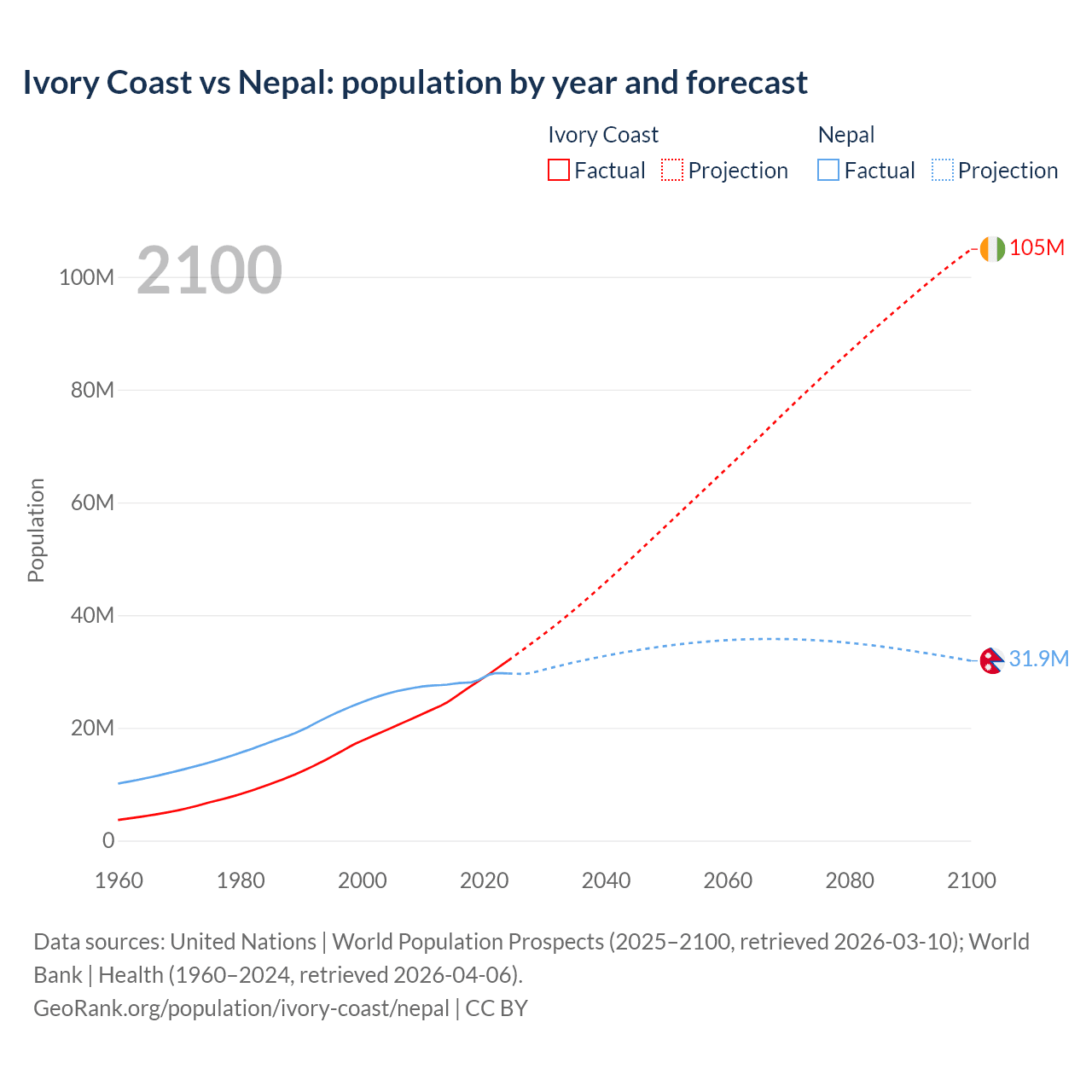 The latest officially reported population of Ivory Coast was 31,934,230 in 2024 vs 29,651,054 people in Nepal in 2024. In 2026, based on the adjusted UN estimation, the current Ivory Coast's population is 33,722,528 people compared to 29,596,762 in Nepal.