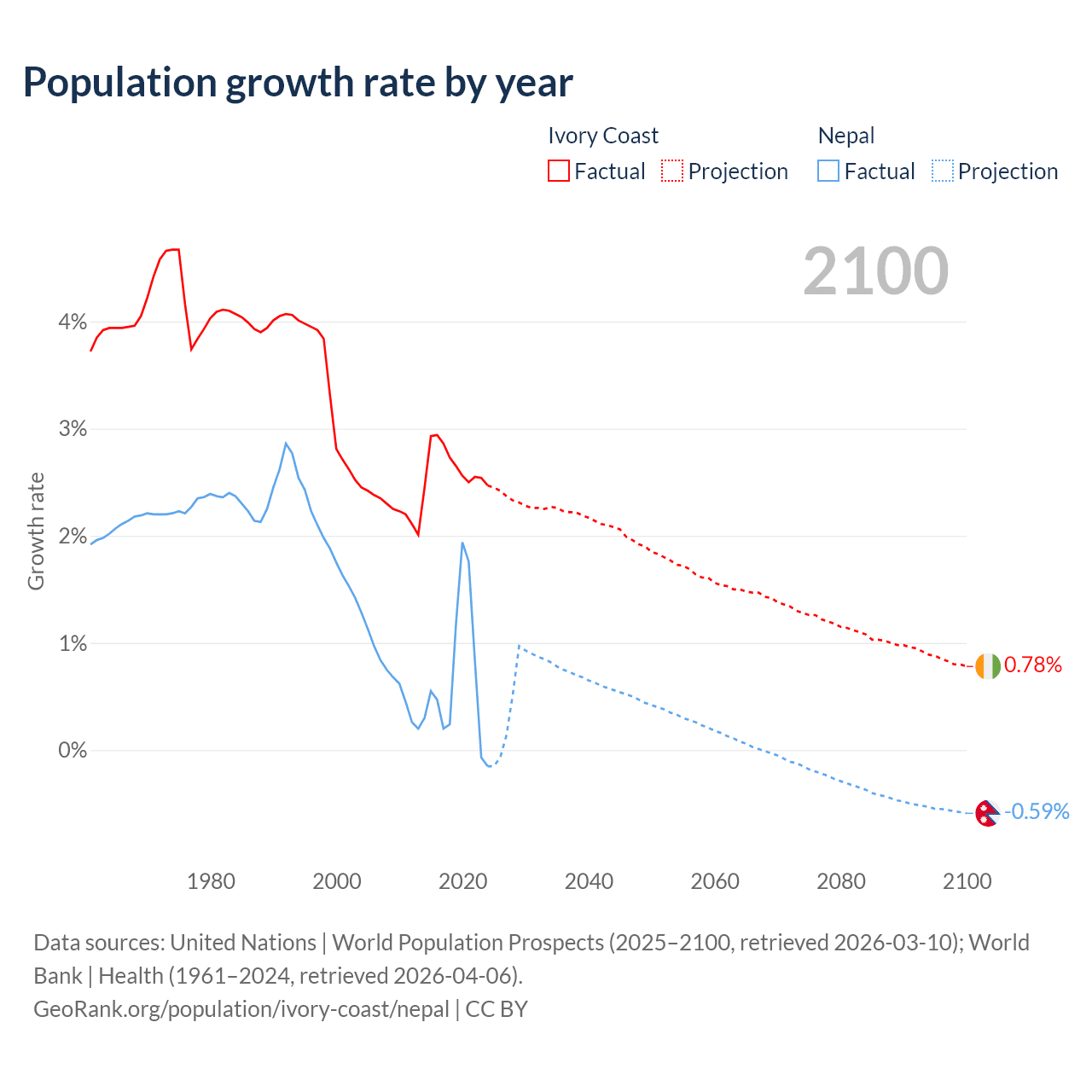 - For the last 10 years, Ivory Coast has had an average growth rate of +2.65% per year vs +0.66% in Nepal.