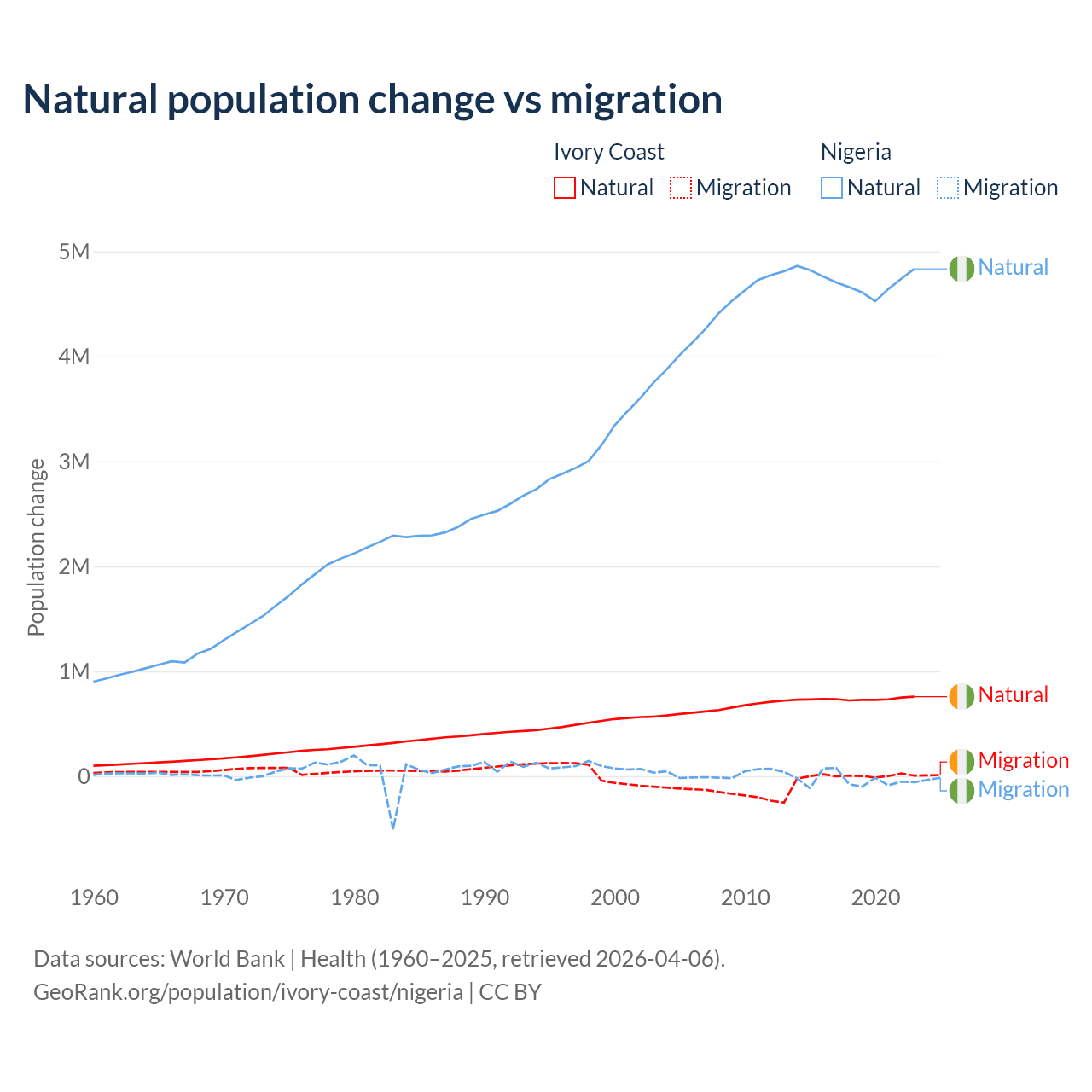Over the last 10 years, 99.7% of the population change in Ivory Coast is from natural causes (a gain of 7,348,944 people) and 0.33% is from migration (a gain of 24,432 people). In Nigeria 99.2% is from natural causes (a gain of 47,163,517 people) and 0.77% is from migration (a loss of 368,103 people).