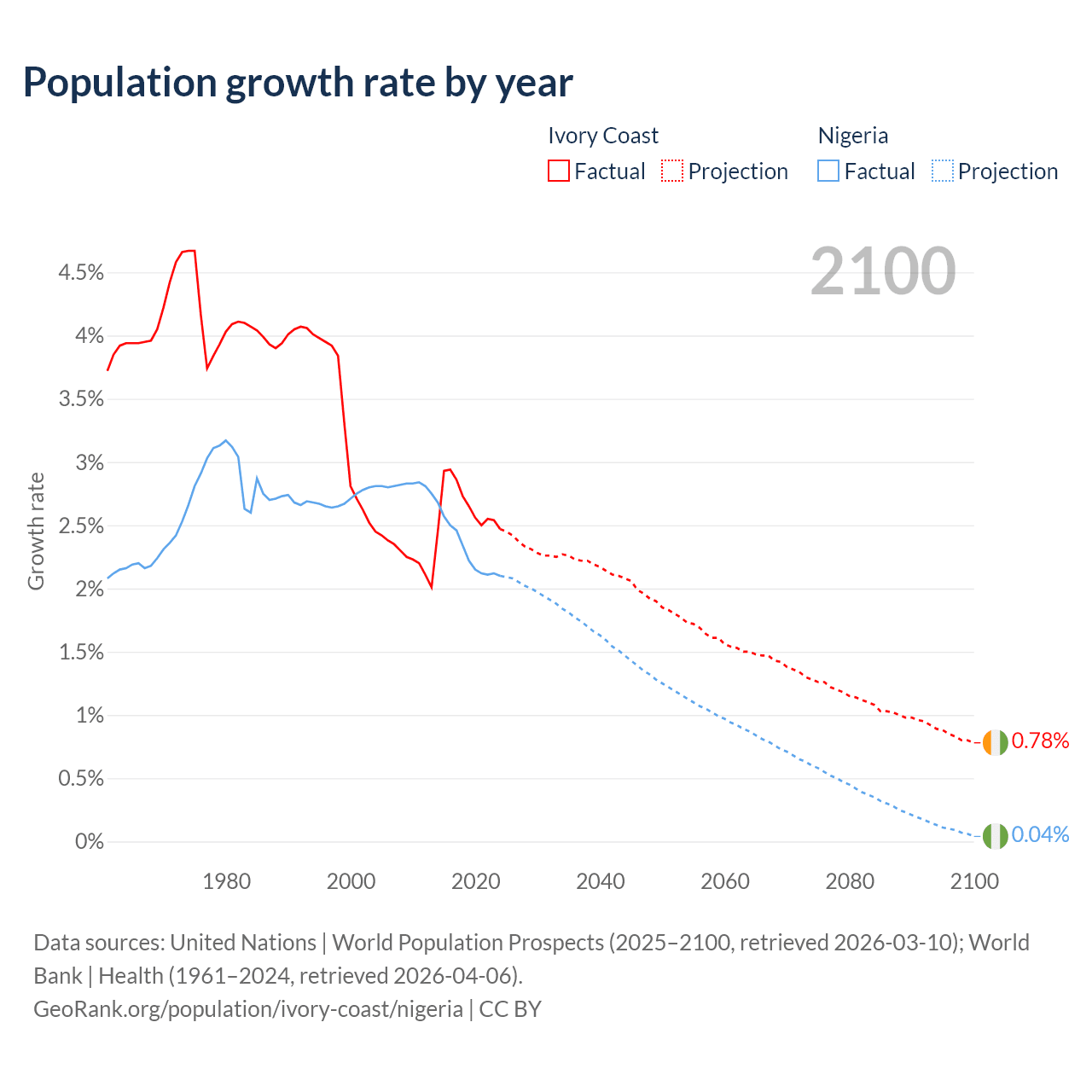 - For the last 10 years, Ivory Coast has had an average growth rate of +2.65% per year vs +2.31% in Nigeria.