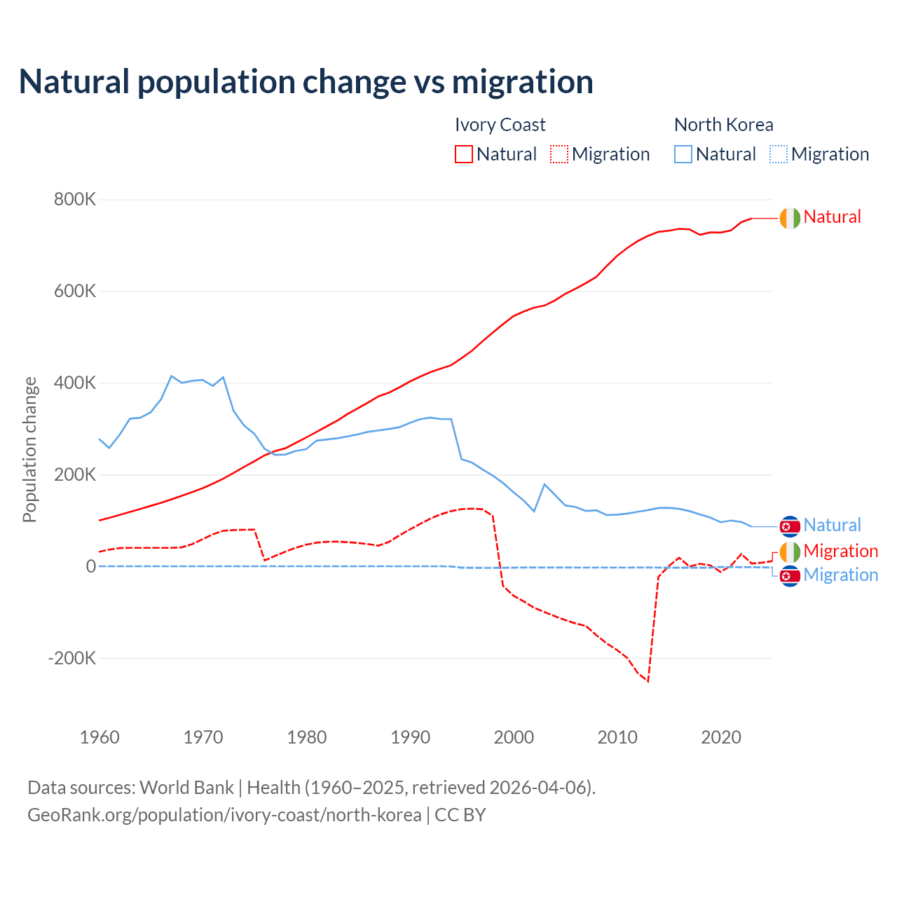 Over the last 10 years, 99.7% of the population change in Ivory Coast is from natural causes (a gain of 7,348,944 people) and 0.33% is from migration (a gain of 24,432 people). In North Korea 97.7% is from natural causes (a gain of 1,097,372 people) and 2.33% is from migration (a loss of 26,227 people).