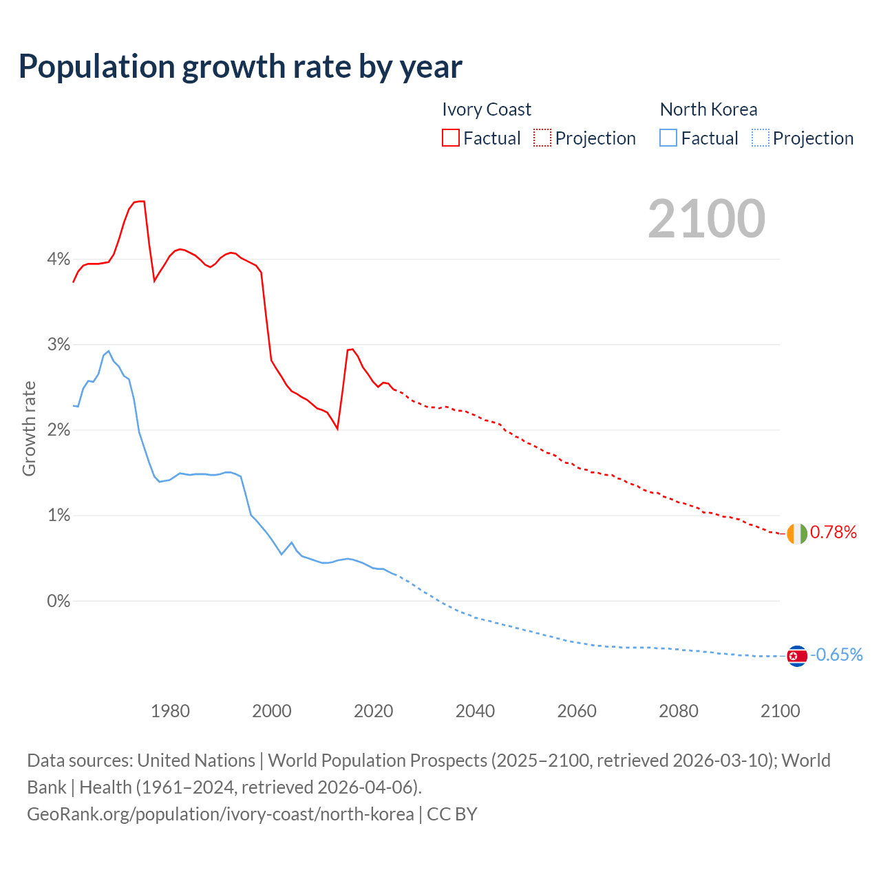 - For the last 10 years, Ivory Coast has had an average growth rate of +2.65% per year vs +0.41% in North Korea.