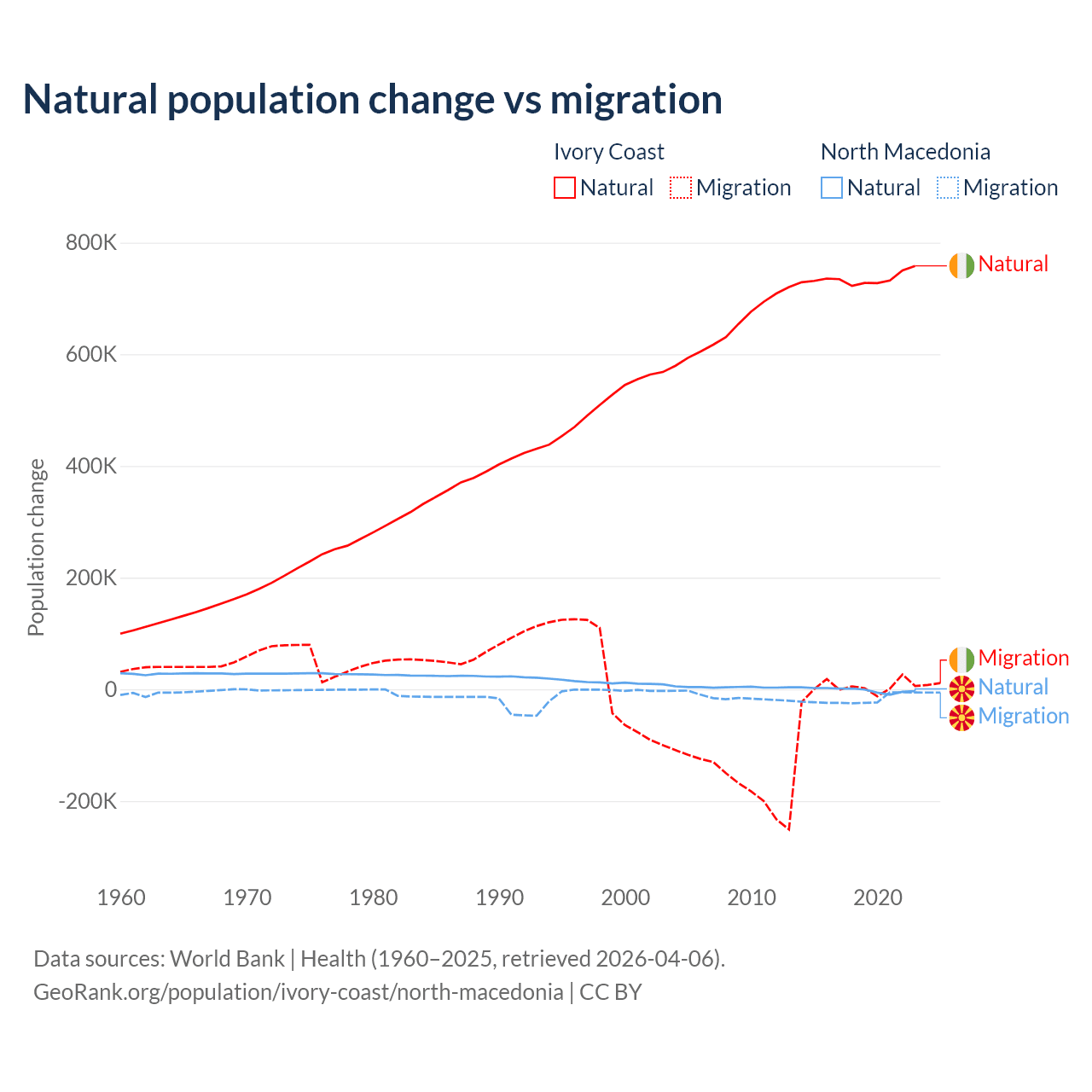 Over the last 10 years, 99.7% of the population change in Ivory Coast is from natural causes (a gain of 7,348,944 people) and 0.33% is from migration (a gain of 24,432 people). In North Macedonia 6.45% is from natural causes (a loss of 12,585 people) and 93.5% is from migration (a loss of 182,429 people).