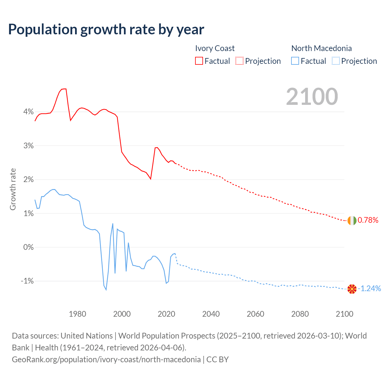 - For the last 10 years, Ivory Coast has had an average growth rate of +2.65% per year vs -0.48% in North Macedonia.