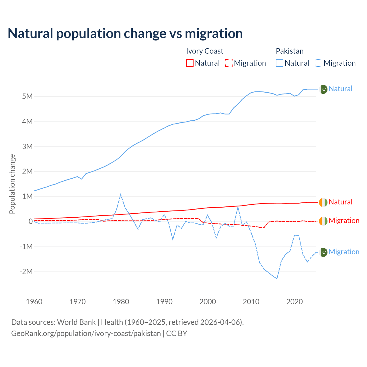 Over the last 10 years, 99.7% of the population change in Ivory Coast is from natural causes (a gain of 7,348,944 people) and 0.33% is from migration (a gain of 24,432 people). In Pakistan 77.8% is from natural causes (a gain of 51,255,404 people) and 22.2% is from migration (a loss of 14,629,055 people).