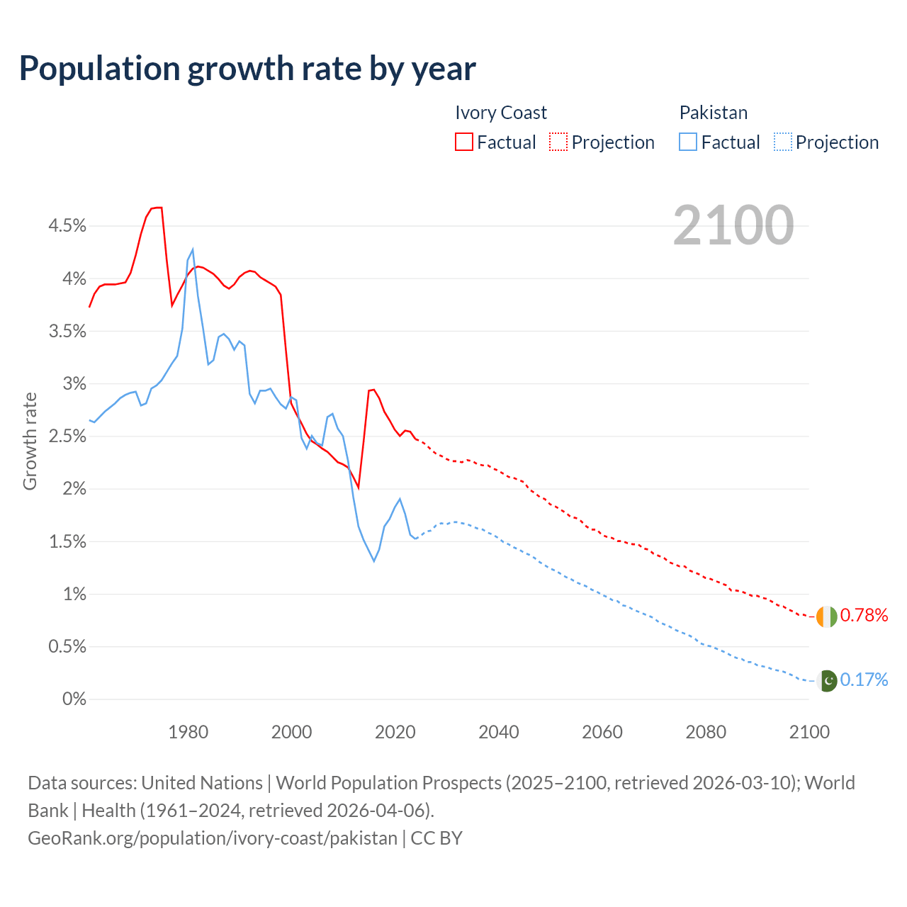 - For the last 10 years, Ivory Coast has had an average growth rate of +2.65% per year vs +1.6% in Pakistan.
