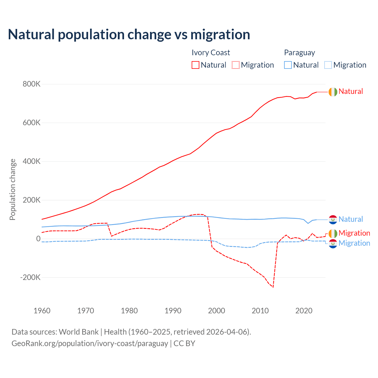 Over the last 10 years, 99.7% of the population change in Ivory Coast is from natural causes (a gain of 7,348,944 people) and 0.33% is from migration (a gain of 24,432 people). In Paraguay 87.6% is from natural causes (a gain of 1,002,636 people) and 12.4% is from migration (a loss of 141,377 people).