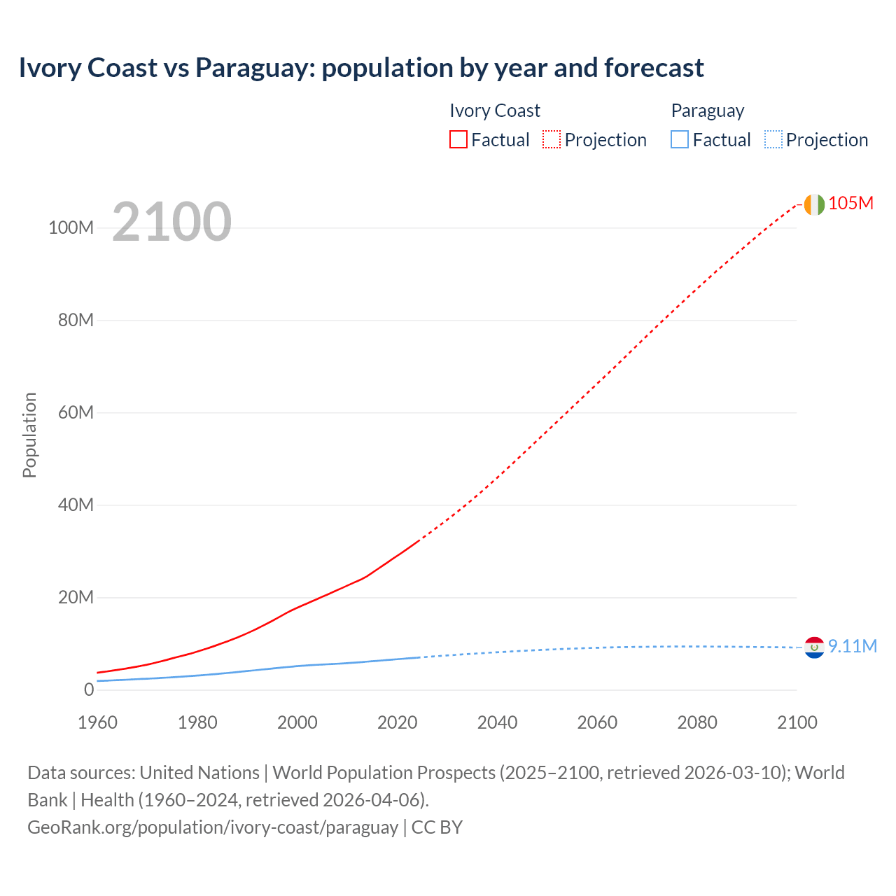 The latest officially reported population of Ivory Coast was 31,934,230 in 2024 vs 6,929,153 people in Paraguay in 2024. In 2026, based on the adjusted UN estimation, the current Ivory Coast's population is 33,722,528 people compared to 7,120,169 in Paraguay.