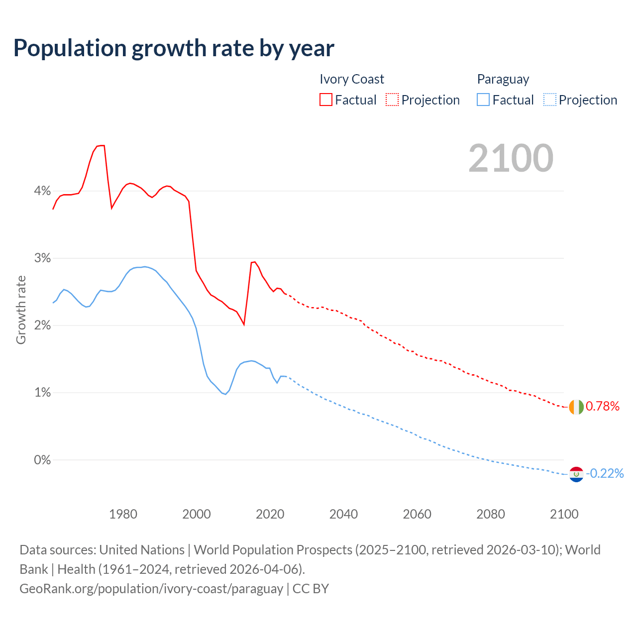 - For the last 10 years, Ivory Coast has had an average growth rate of +2.65% per year vs +1.34% in Paraguay.