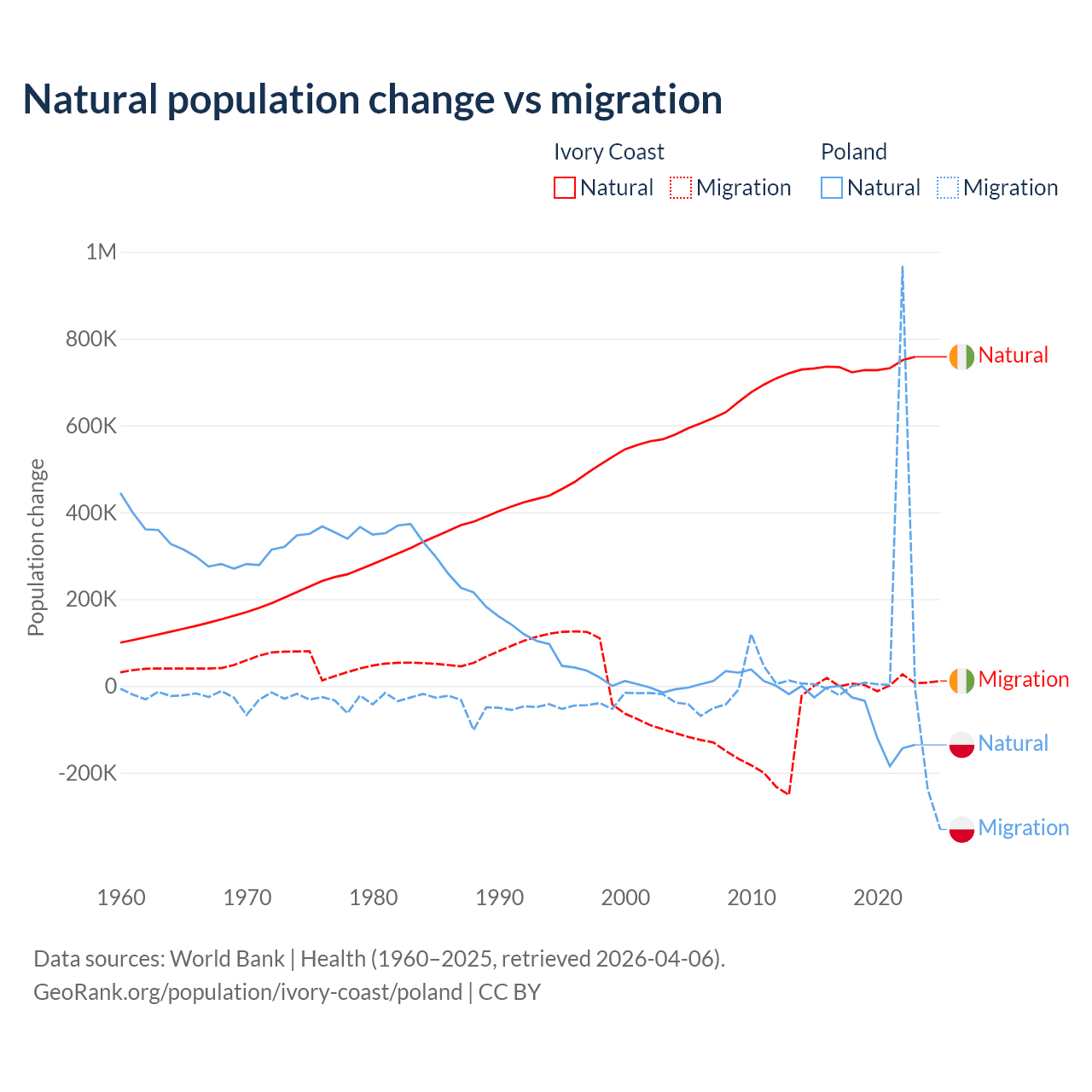 Over the last 10 years, 99.7% of the population change in Ivory Coast is from natural causes (a gain of 7,348,944 people) and 0.33% is from migration (a gain of 24,432 people). In Poland 41.4% is from natural causes (a loss of 675,443 people) and 58.6% is from migration (a gain of 955,766 people).