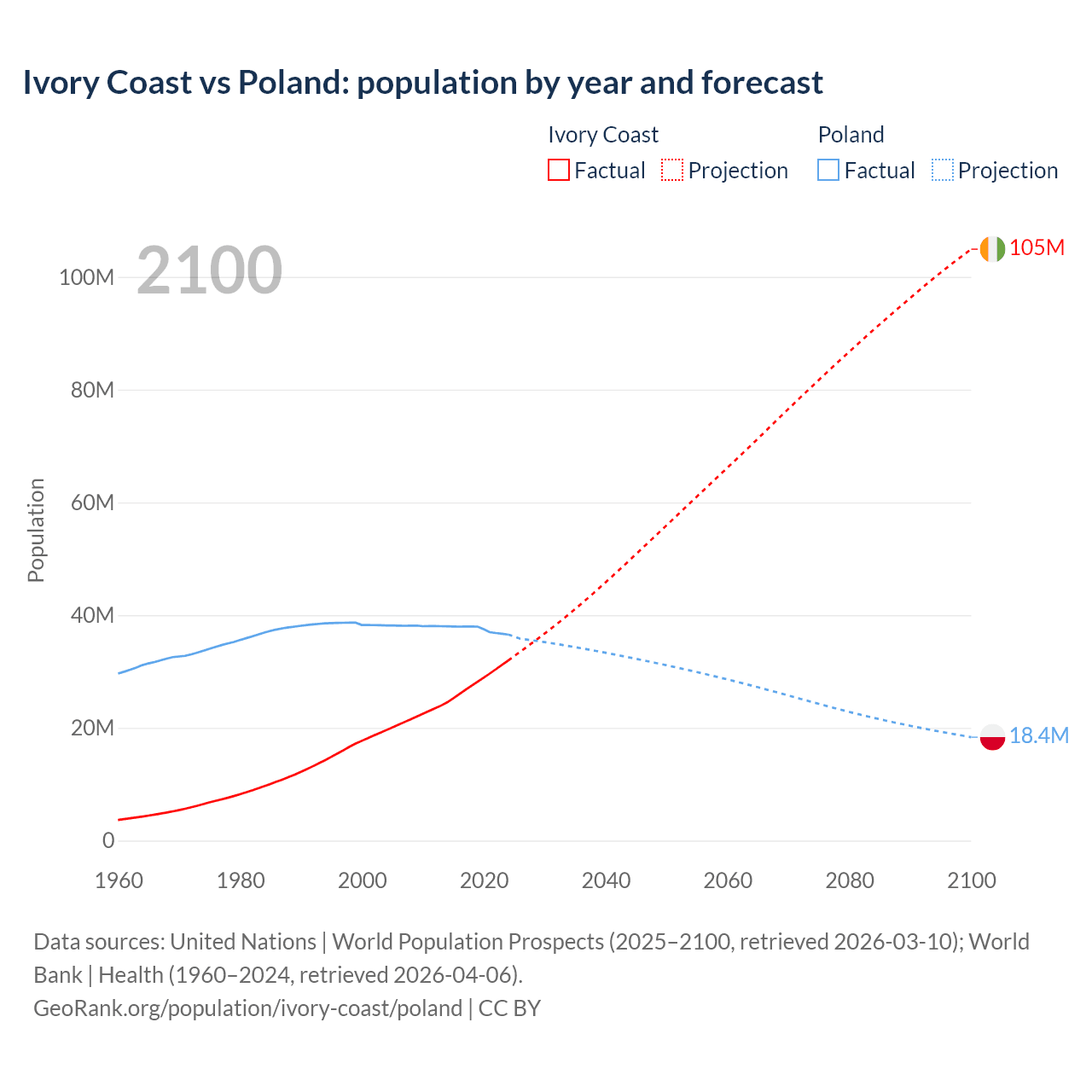 The latest officially reported population of Ivory Coast was 31,934,230 in 2024 vs 36,559,233 people in Poland in 2024. In 2026, based on the adjusted UN estimation, the current Ivory Coast's population is 33,722,528 people compared to 35,806,942 in Poland.
