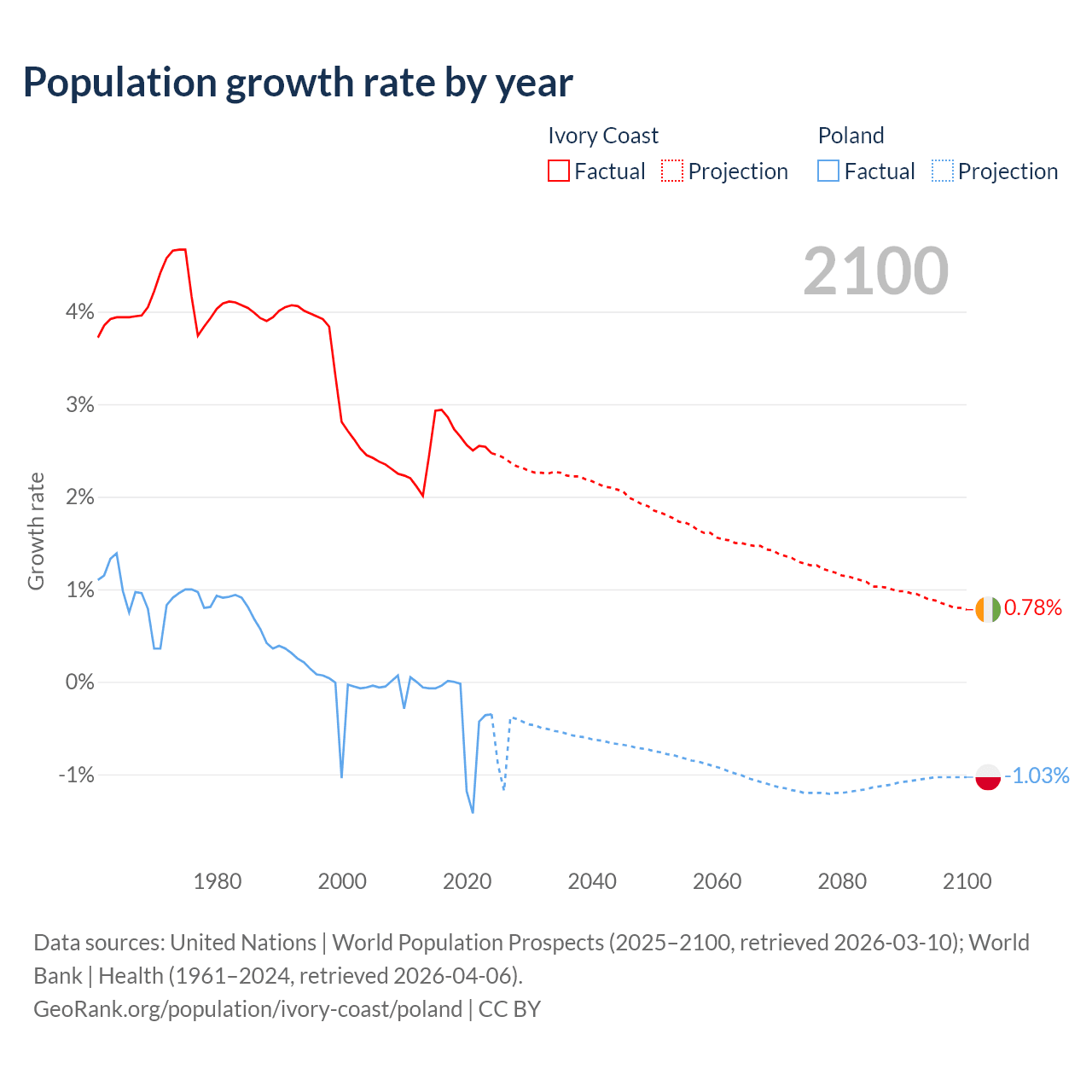 - For the last 10 years, Ivory Coast has had an average growth rate of +2.65% per year vs -0.36% in Poland.