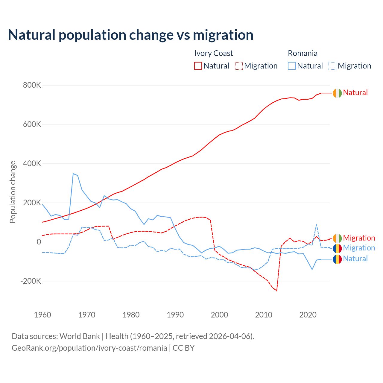 Over the last 10 years, 99.7% of the population change in Ivory Coast is from natural causes (a gain of 7,348,944 people) and 0.33% is from migration (a gain of 24,432 people). In Romania 82% is from natural causes (a loss of 766,295 people) and 18% is from migration (a loss of 167,917 people).