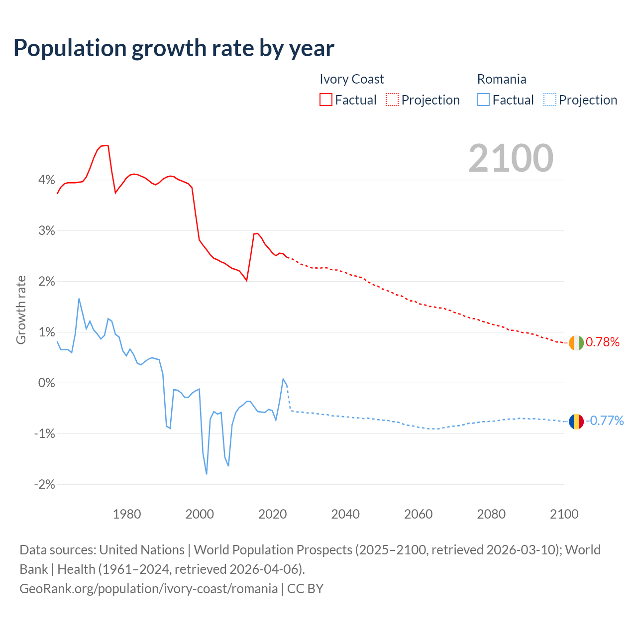 - For the last 10 years, Ivory Coast has had an average growth rate of +2.65% per year vs -0.43% in Romania.