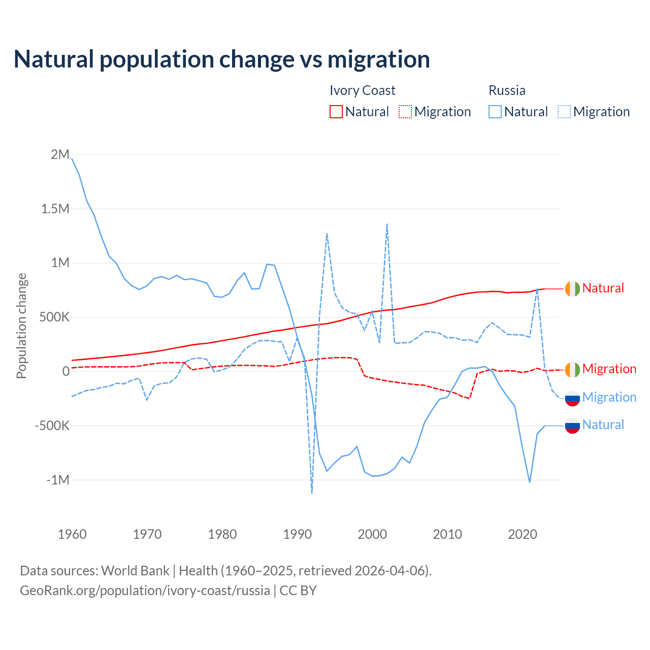 Over the last 10 years, 99.7% of the population change in Ivory Coast is from natural causes (a gain of 7,348,944 people) and 0.33% is from migration (a gain of 24,432 people). In Russia 48.6% is from natural causes (a loss of 3,416,377 people) and 51.4% is from migration (a gain of 3,611,826 people).