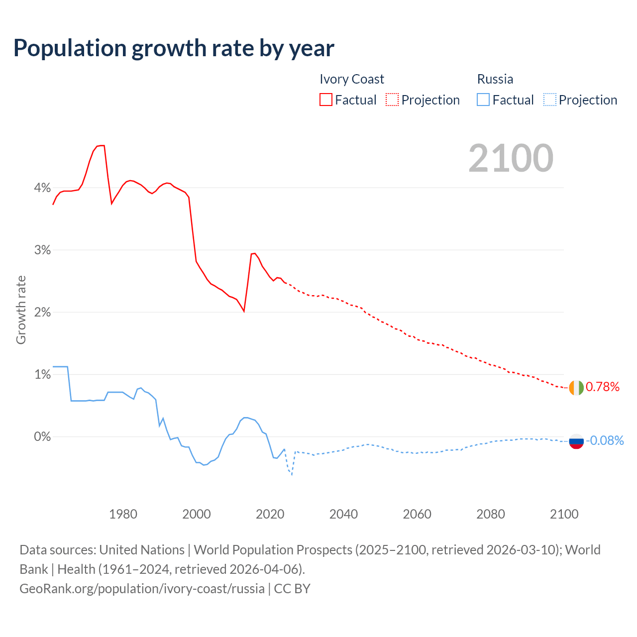 - For the last 10 years, Ivory Coast has had an average growth rate of +2.65% per year vs -0.02% in Russia.