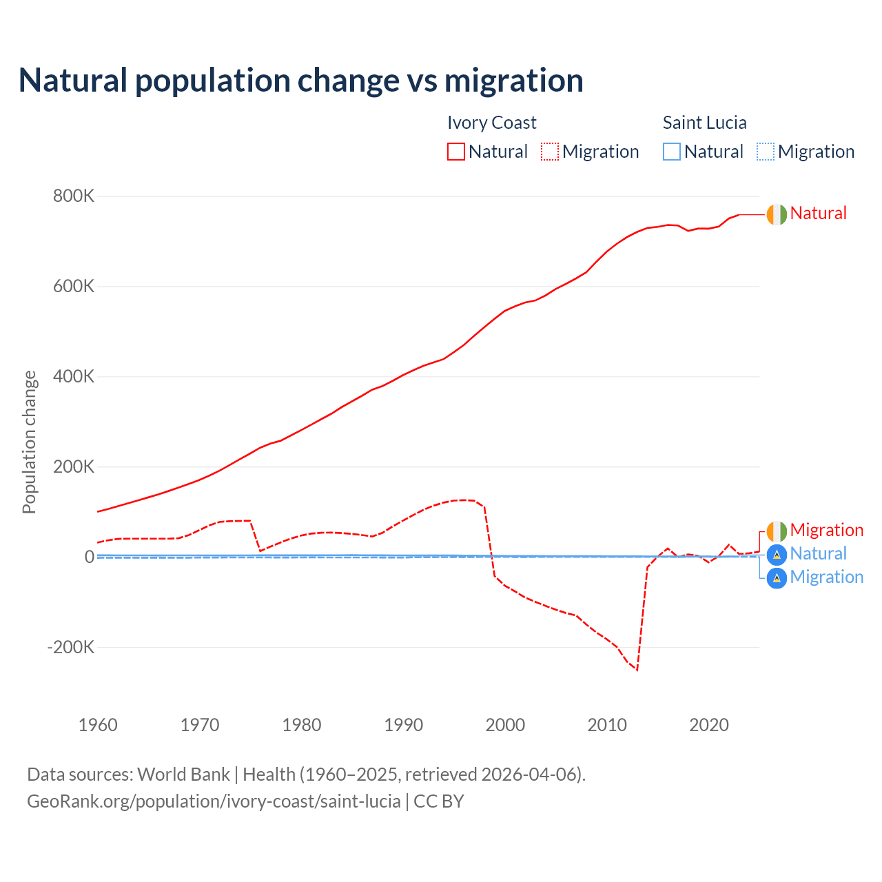Over the last 10 years, 99.7% of the population change in Ivory Coast is from natural causes (a gain of 7,348,944 people) and 0.33% is from migration (a gain of 24,432 people). In Saint Lucia 95.7% is from natural causes (a gain of 6,039 people) and 4.31% is from migration (a loss of 272 people).