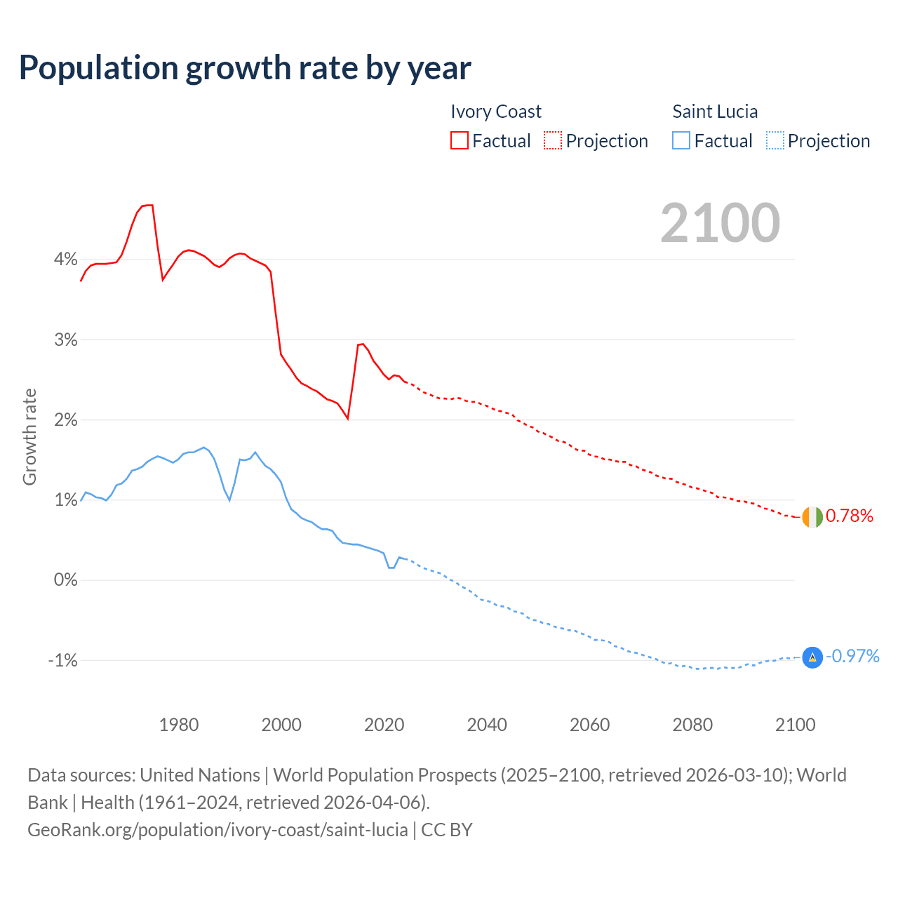 - For the last 10 years, Ivory Coast has had an average growth rate of +2.65% per year vs +0.33% in Saint Lucia.