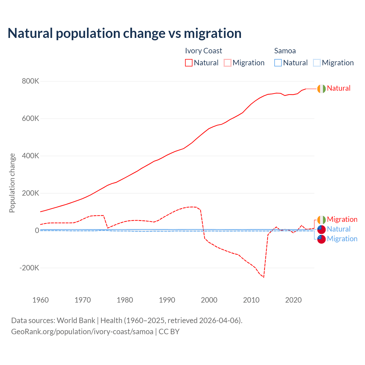 Over the last 10 years, 99.7% of the population change in Ivory Coast is from natural causes (a gain of 7,348,944 people) and 0.33% is from migration (a gain of 24,432 people). In Samoa 62.5% is from natural causes (a gain of 45,436 people) and 37.5% is from migration (a loss of 27,246 people).