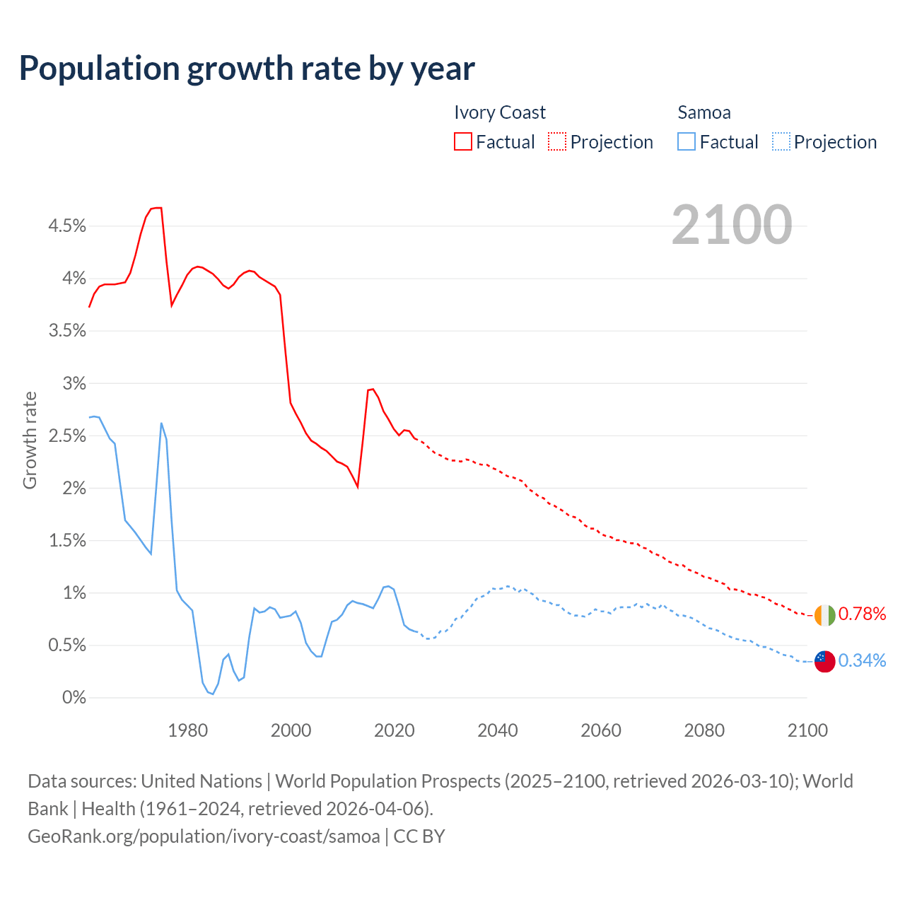 Ivory Coast vs Samoa: population by year and forecast
