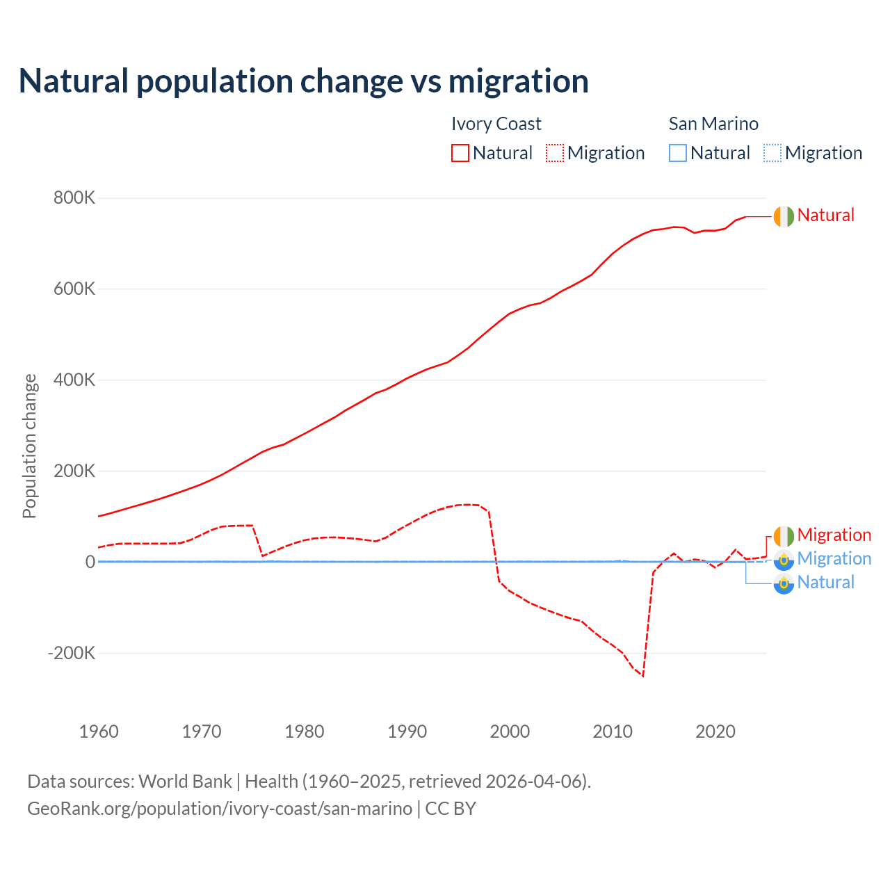Over the last 10 years, 99.7% of the population change in Ivory Coast is from natural causes (a gain of 7,348,944 people) and 0.33% is from migration (a gain of 24,432 people). In San Marino 40.9% is from natural causes (a loss of 358 people) and 59.1% is from migration (a gain of 517 people).