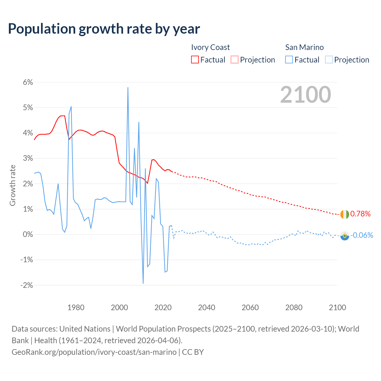 - For the last 10 years, Ivory Coast has had an average growth rate of +2.65% per year vs +0.26% in San Marino.