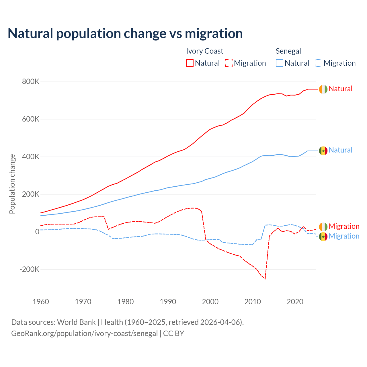 Over the last 10 years, 99.7% of the population change in Ivory Coast is from natural causes (a gain of 7,348,944 people) and 0.33% is from migration (a gain of 24,432 people). In Senegal 93.9% is from natural causes (a gain of 4,089,205 people) and 6.13% is from migration (a gain of 267,266 people).