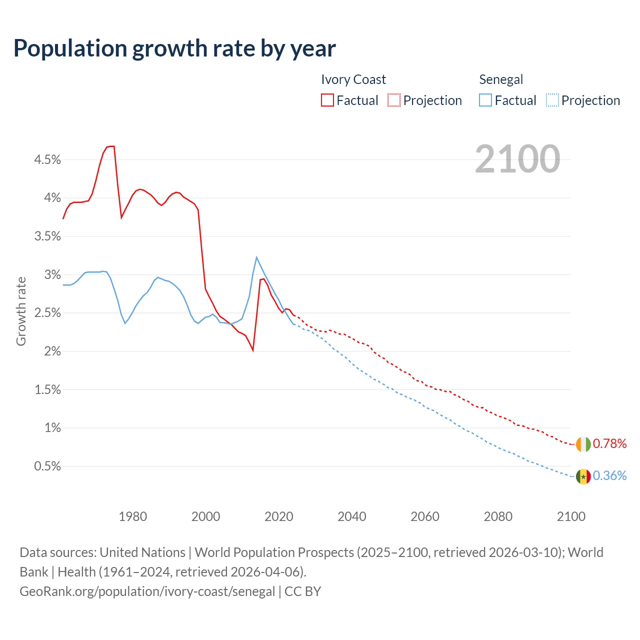 - For the last 10 years, Ivory Coast has had an average growth rate of +2.65% per year vs +2.76% in Senegal.