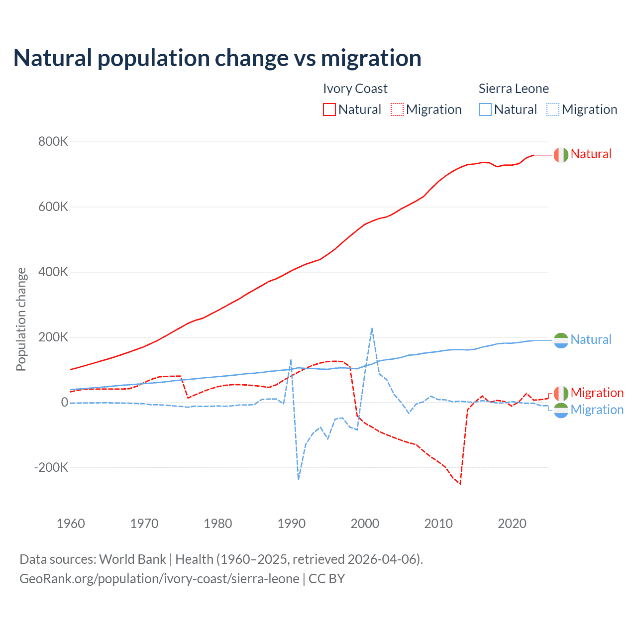Over the last 10 years, 99.7% of the population change in Ivory Coast is from natural causes (a gain of 7,348,944 people) and 0.33% is from migration (a gain of 24,432 people). In Sierra Leone 99.6% is from natural causes (a gain of 1,764,049 people) and 0.41% is from migration (a loss of 7,211 people).