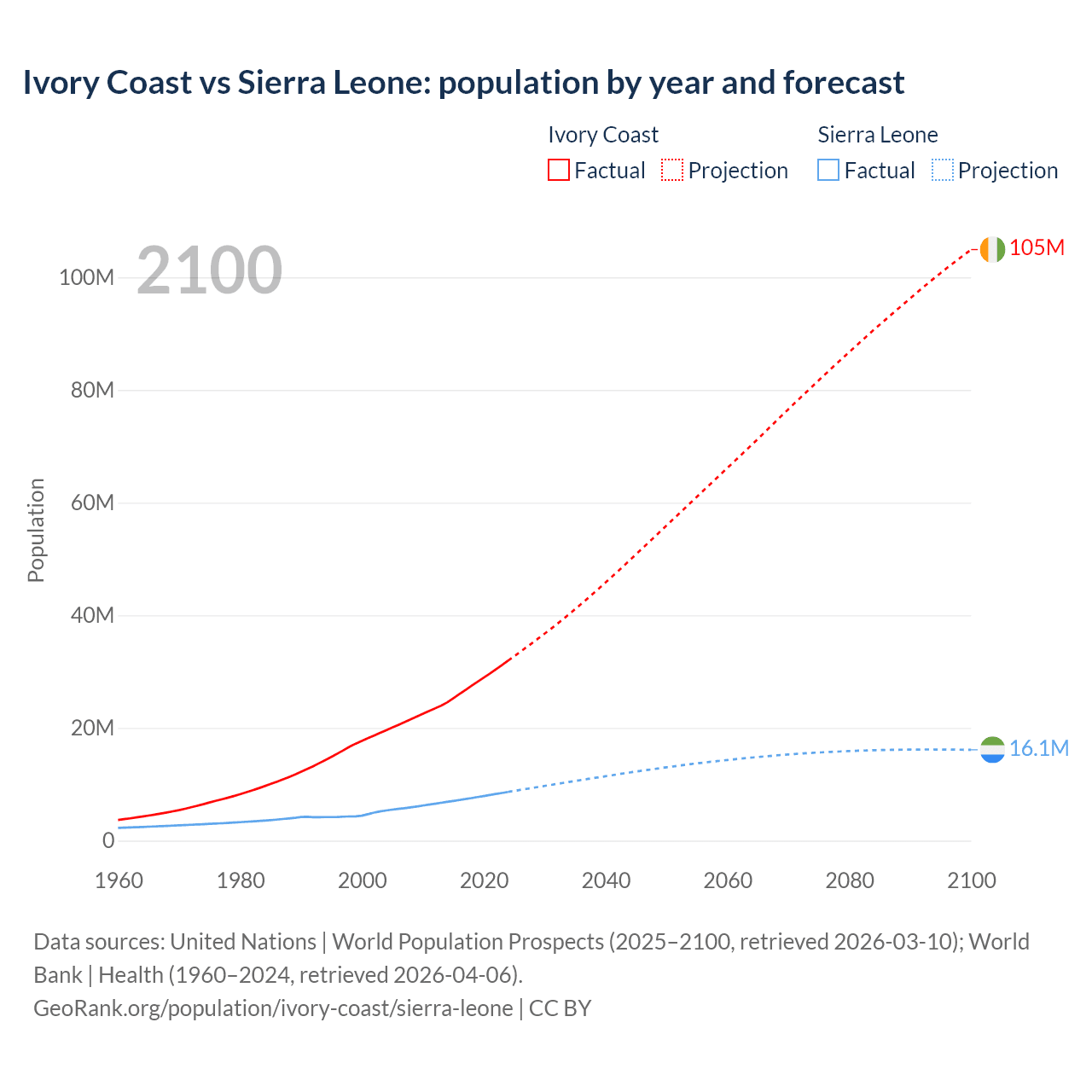 The latest officially reported population of Ivory Coast was 31,934,230 in 2024 vs 8,642,022 people in Sierra Leone in 2024. In 2026, based on the adjusted UN estimation, the current Ivory Coast's population is 33,722,528 people compared to 9,049,533 in Sierra Leone.