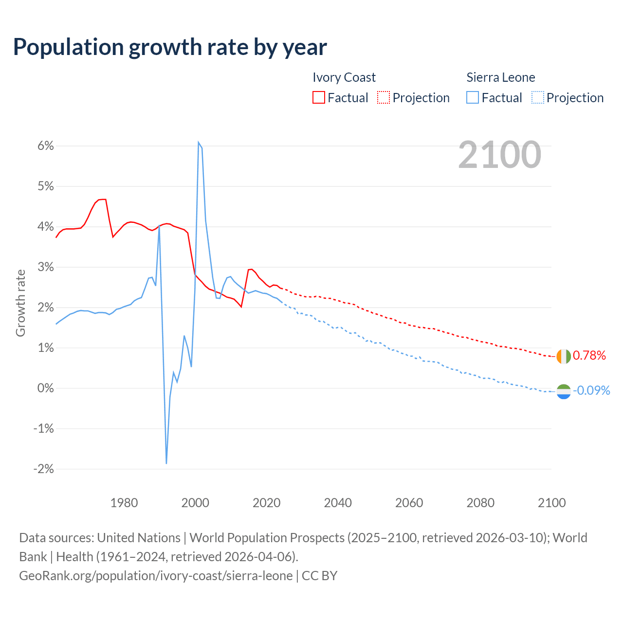 - For the last 10 years, Ivory Coast has had an average growth rate of +2.65% per year vs +2.32% in Sierra Leone.