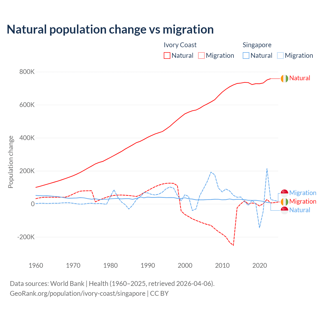 Over the last 10 years, 99.7% of the population change in Ivory Coast is from natural causes (a gain of 7,348,944 people) and 0.33% is from migration (a gain of 24,432 people). In Singapore 54.8% is from natural causes (a gain of 195,953 people) and 45.2% is from migration (a gain of 161,805 people).