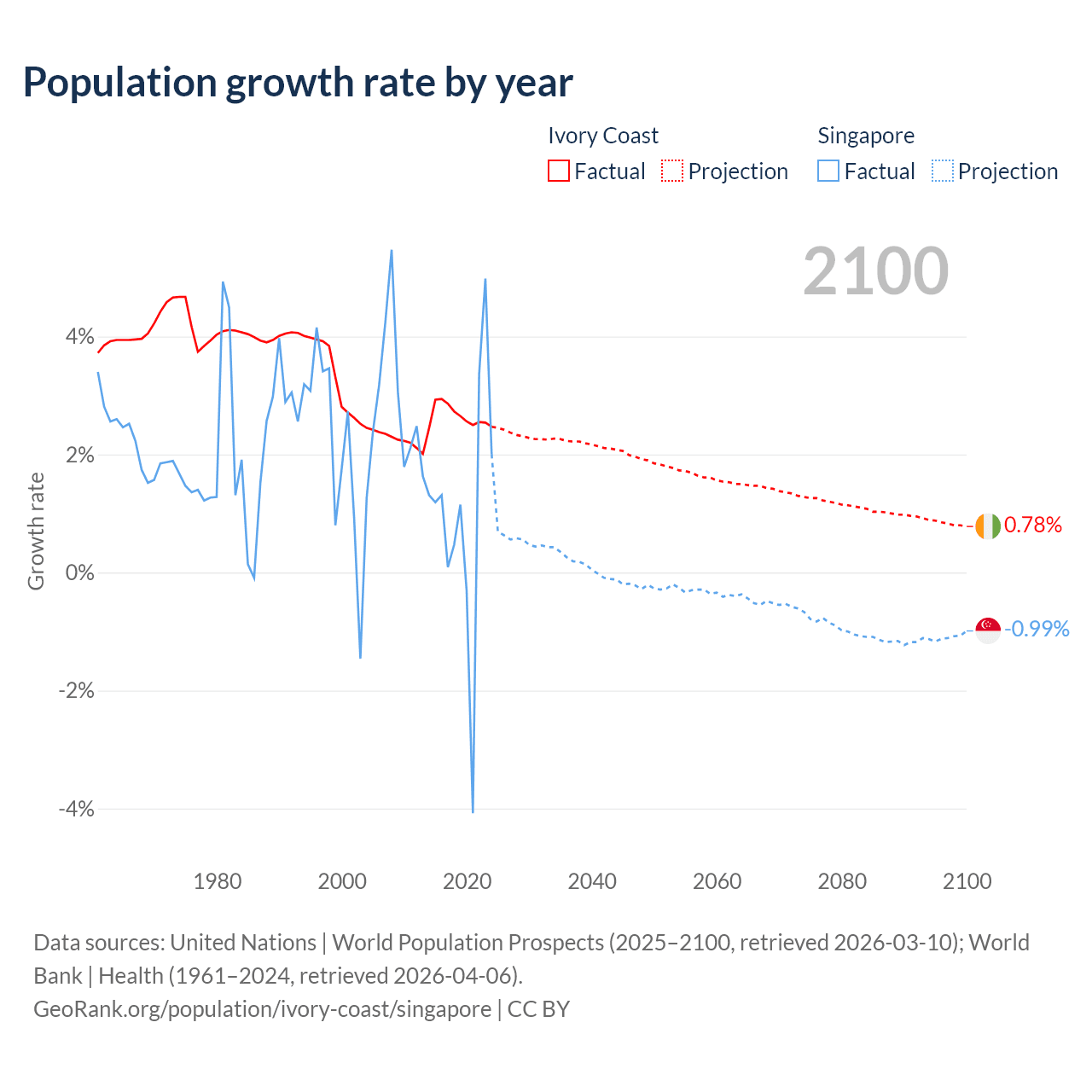 - For the last 10 years, Ivory Coast has had an average growth rate of +2.65% per year vs +1.04% in Singapore.