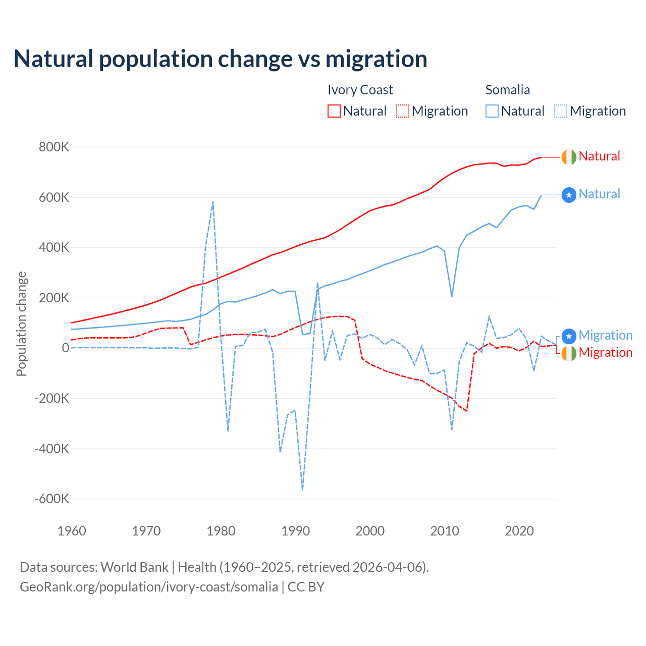Over the last 10 years, 99.7% of the population change in Ivory Coast is from natural causes (a gain of 7,348,944 people) and 0.33% is from migration (a gain of 24,432 people). In Somalia 94.4% is from natural causes (a gain of 5,270,105 people) and 5.58% is from migration (a gain of 311,487 people).