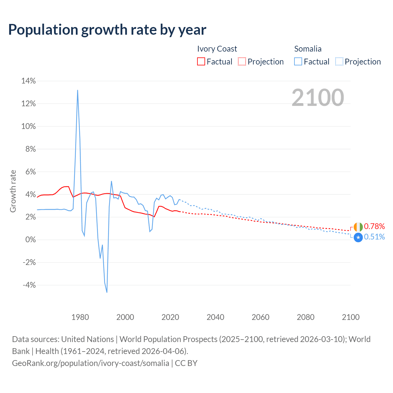- For the last 10 years, Ivory Coast has had an average growth rate of +2.65% per year vs +3.61% in Somalia.