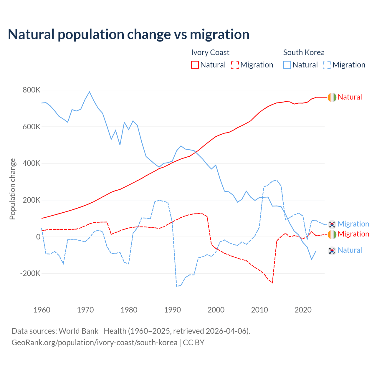 Over the last 10 years, 99.7% of the population change in Ivory Coast is from natural causes (a gain of 7,348,944 people) and 0.33% is from migration (a gain of 24,432 people). In South Korea 17.6% is from natural causes (a gain of 277,215 people) and 82.4% is from migration (a gain of 1,298,356 people).