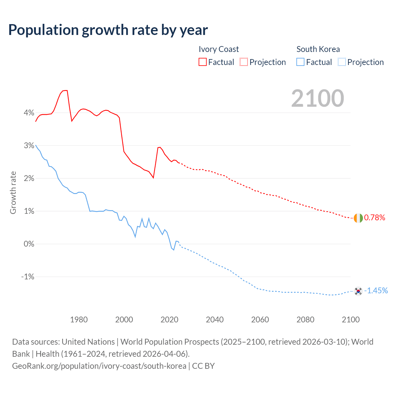 - For the last 10 years, Ivory Coast has had an average growth rate of +2.65% per year vs +0.24% in South Korea.