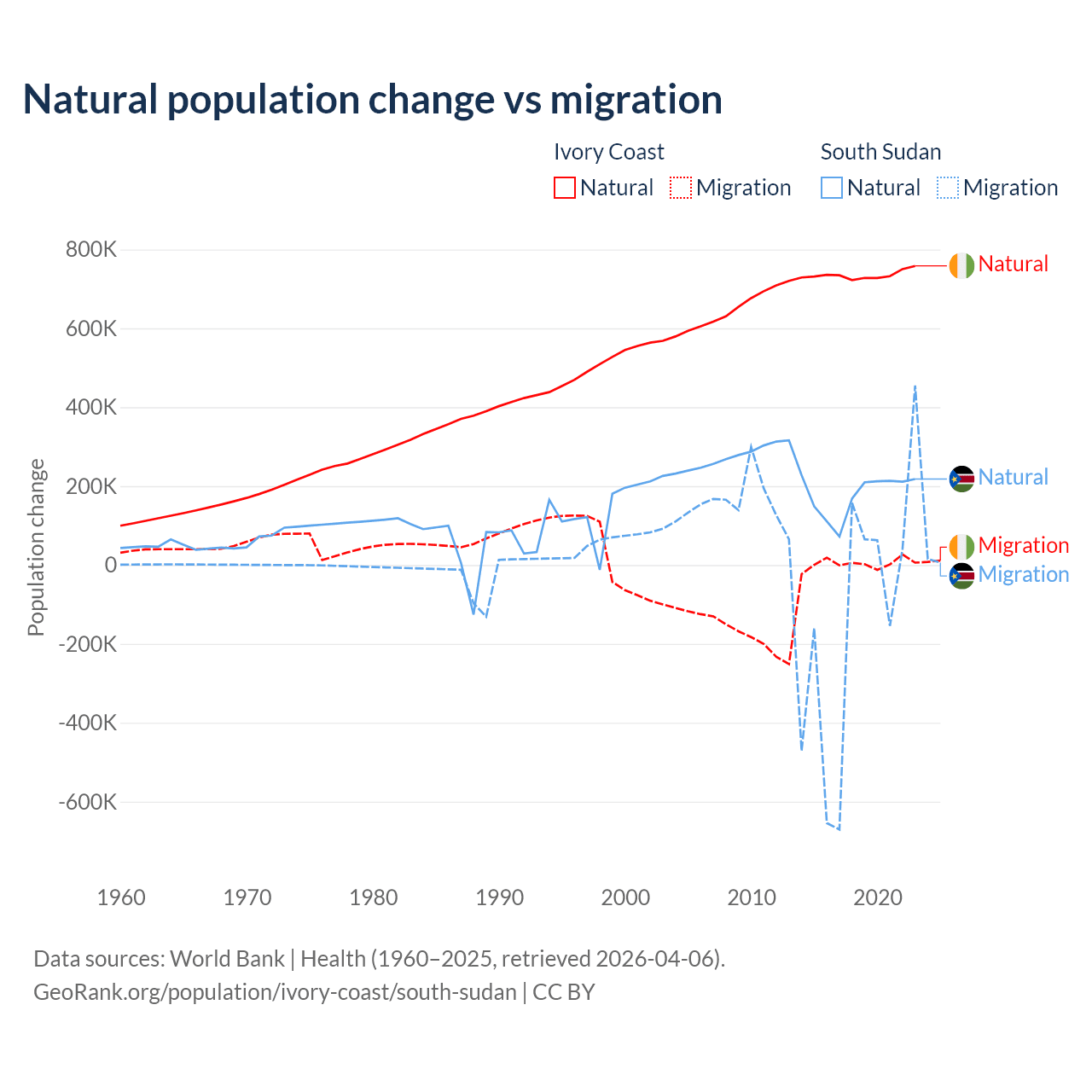 Over the last 10 years, 99.7% of the population change in Ivory Coast is from natural causes (a gain of 7,348,944 people) and 0.33% is from migration (a gain of 24,432 people). In South Sudan 57.4% is from natural causes (a gain of 1,792,135 people) and 42.6% is from migration (a loss of 1,329,606 people).