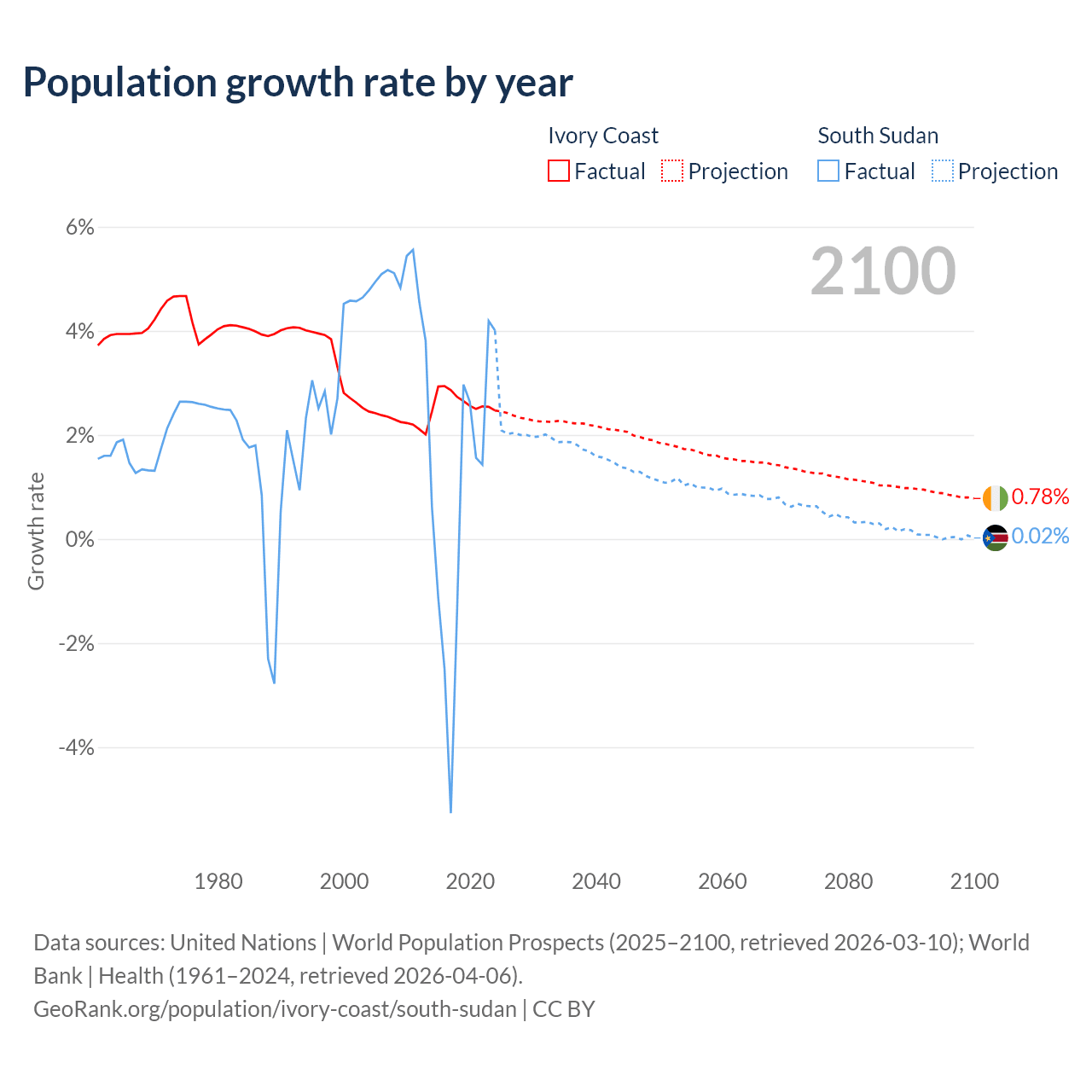 - For the last 10 years, Ivory Coast has had an average growth rate of +2.65% per year vs +0.65% in South Sudan.