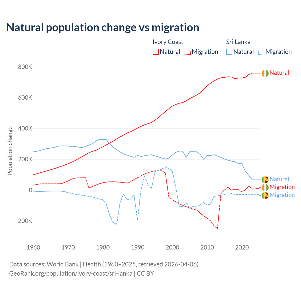 Over the last 10 years, 99.7% of the population change in Ivory Coast is from natural causes (a gain of 7,348,944 people) and 0.33% is from migration (a gain of 24,432 people). In Sri Lanka 85.3% is from natural causes (a gain of 1,605,749 people) and 14.7% is from migration (a loss of 276,121 people).