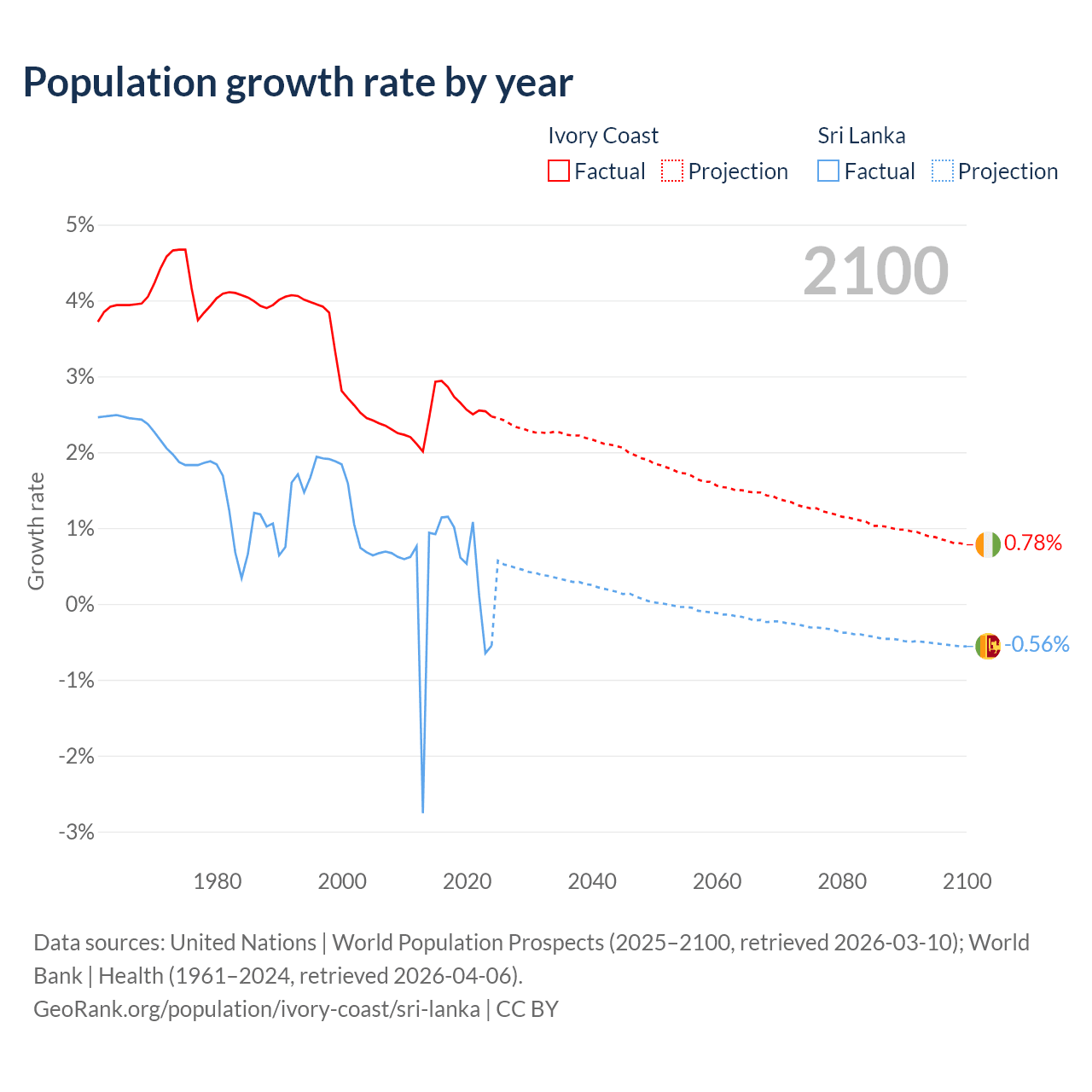- For the last 10 years, Ivory Coast has had an average growth rate of +2.65% per year vs +0.57% in Sri Lanka.