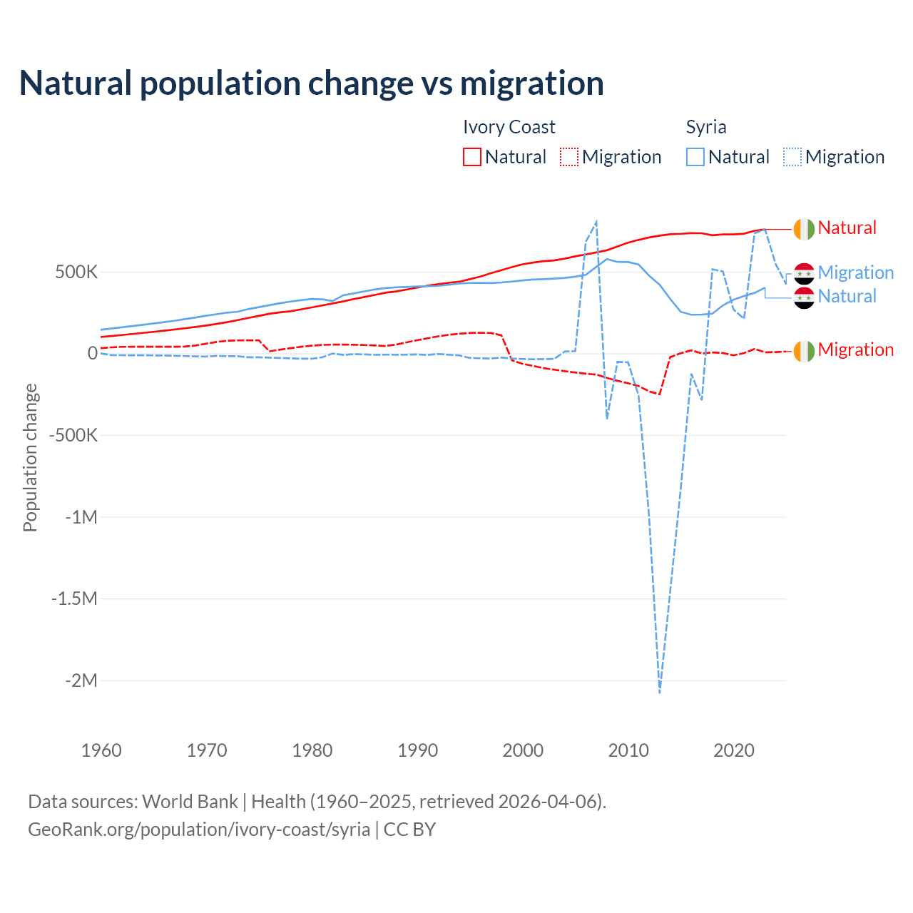Over the last 10 years, 99.7% of the population change in Ivory Coast is from natural causes (a gain of 7,348,944 people) and 0.33% is from migration (a gain of 24,432 people). In Syria 91.3% is from natural causes (a gain of 3,047,621 people) and 8.72% is from migration (a gain of 291,069 people).