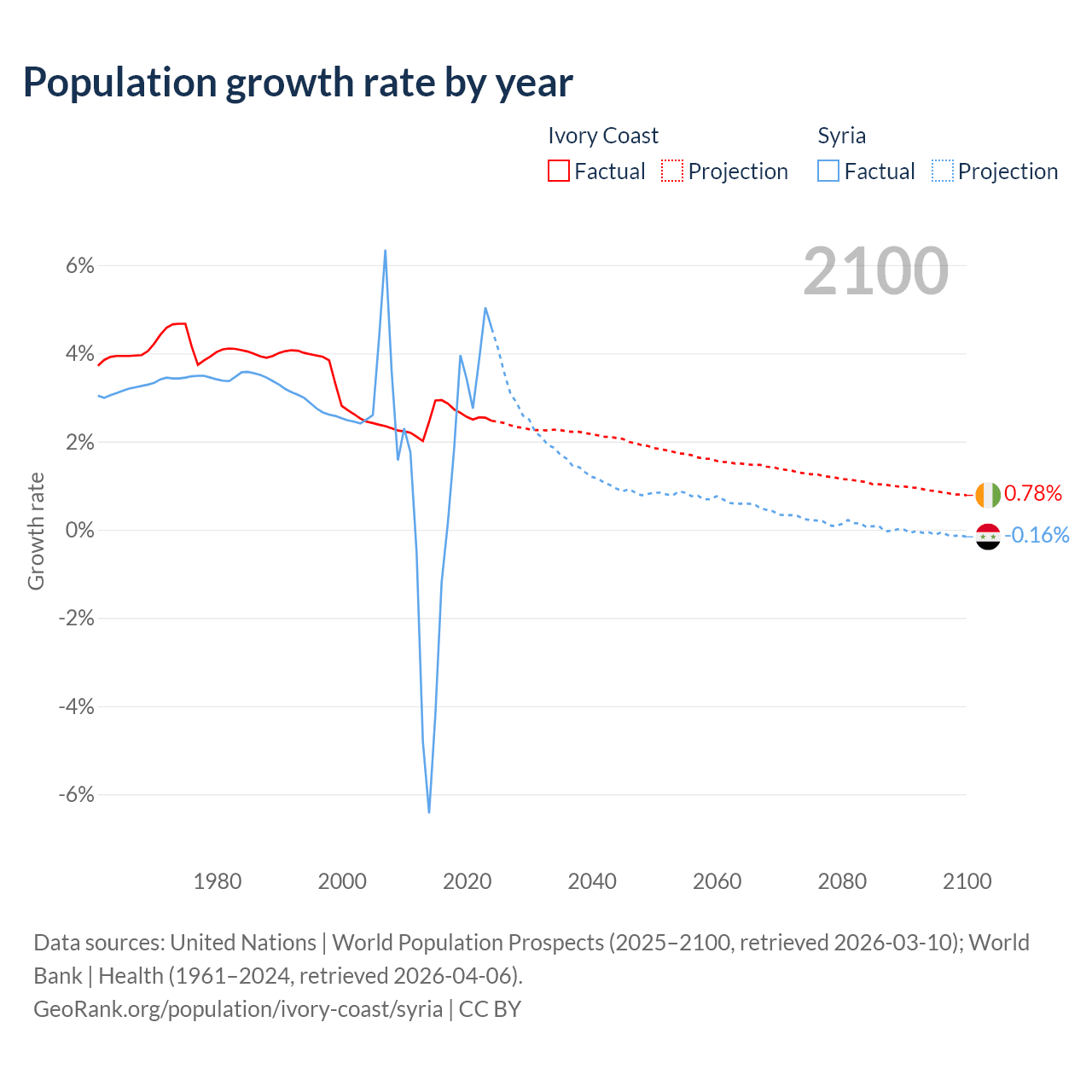 - For the last 10 years, Ivory Coast has had an average growth rate of +2.65% per year vs +1.25% in Syria.