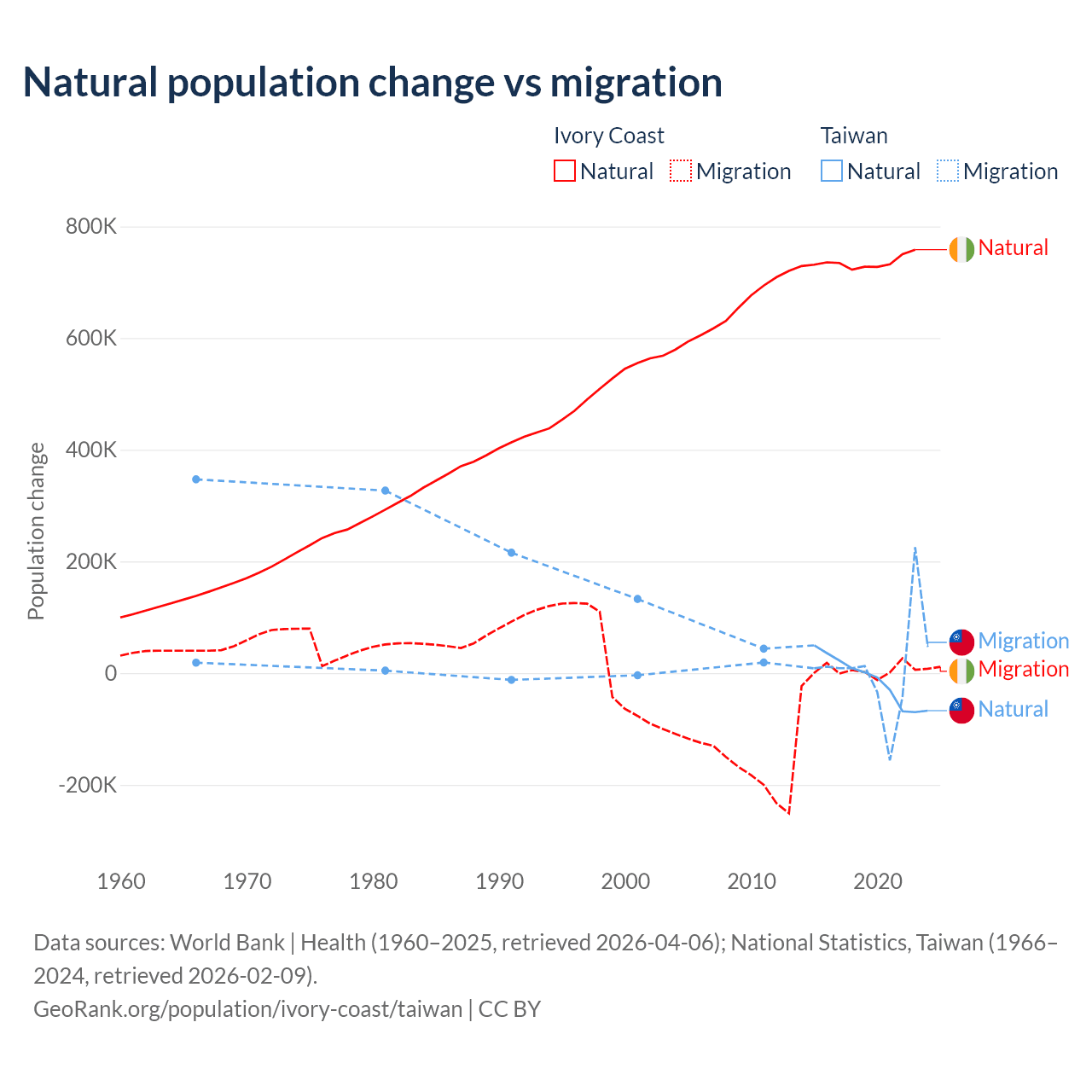 Over the last 10 years, 99.7% of the population change in Ivory Coast is from natural causes (a gain of 7,348,944 people) and 0.33% is from migration (a gain of 24,432 people). In Taiwan 56.7% is from natural causes (a loss of 57,467 people) and 43.3% is from migration (a gain of 43,884 people).