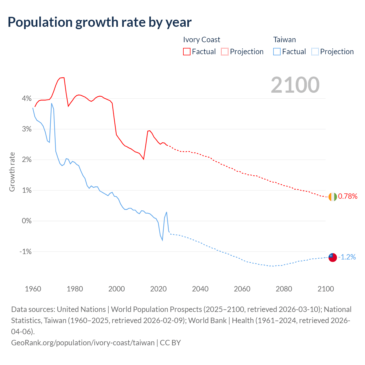 Data sources: World Bank | Health (1960–2024, retrieved 2026-04-06); United Nations | World Population Prospects (1960–2026, retrieved 2026-03-10); U.S. Census Bureau (1960–2025, retrieved 2026-02-08); National Statistics, Taiwan (1960–2025, retrieved 2026-02-09); Central Intelligence Agency (CIA) (2000–2019, retrieved 2026-02-20).