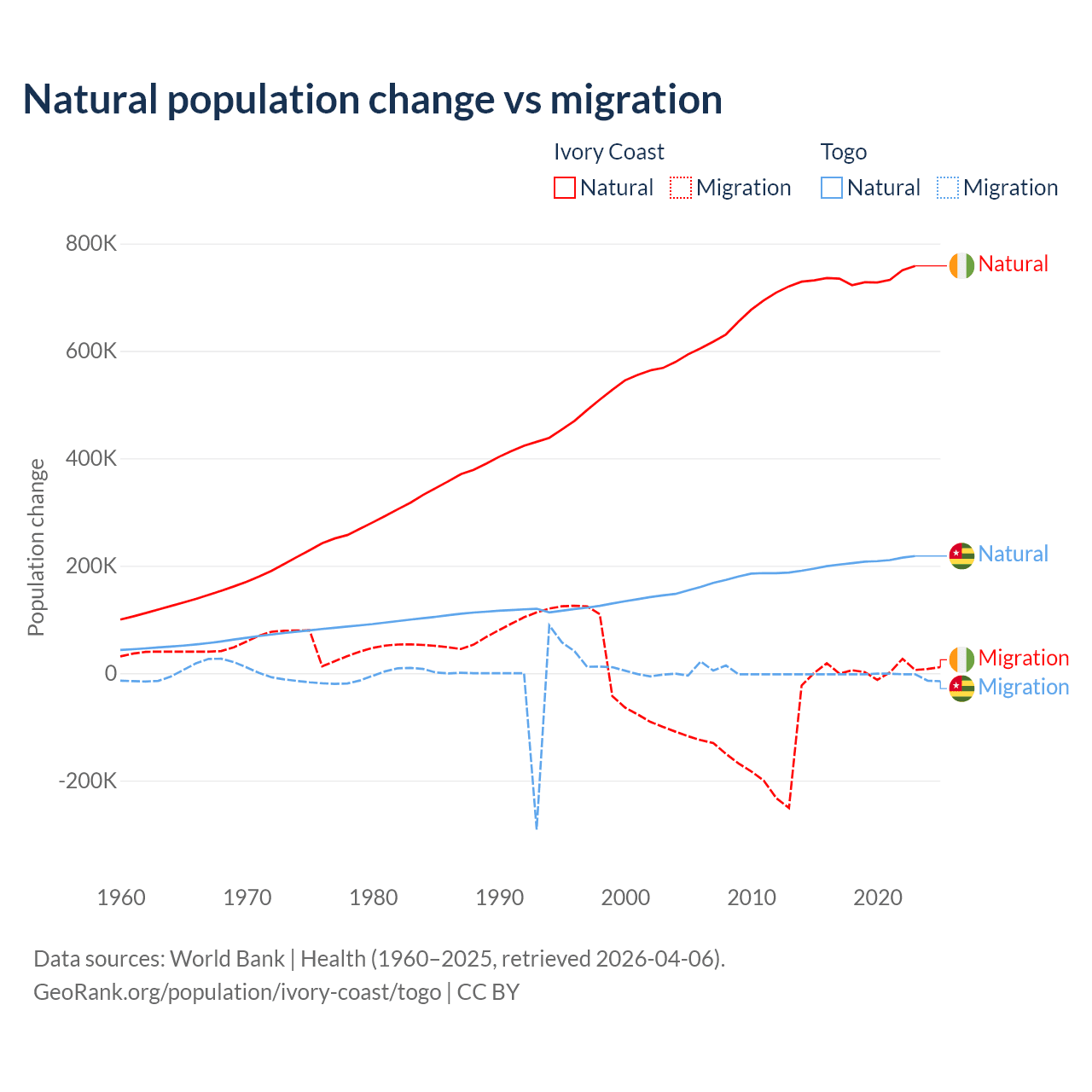 Over the last 10 years, 99.7% of the population change in Ivory Coast is from natural causes (a gain of 7,348,944 people) and 0.33% is from migration (a gain of 24,432 people). In Togo 99.1% is from natural causes (a gain of 2,052,115 people) and 0.86% is from migration (a loss of 17,852 people).