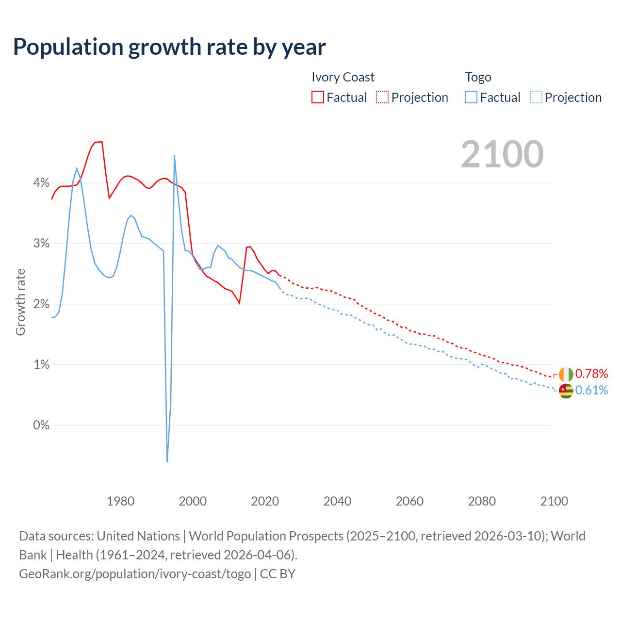 - For the last 10 years, Ivory Coast has had an average growth rate of +2.65% per year vs +2.46% in Togo.